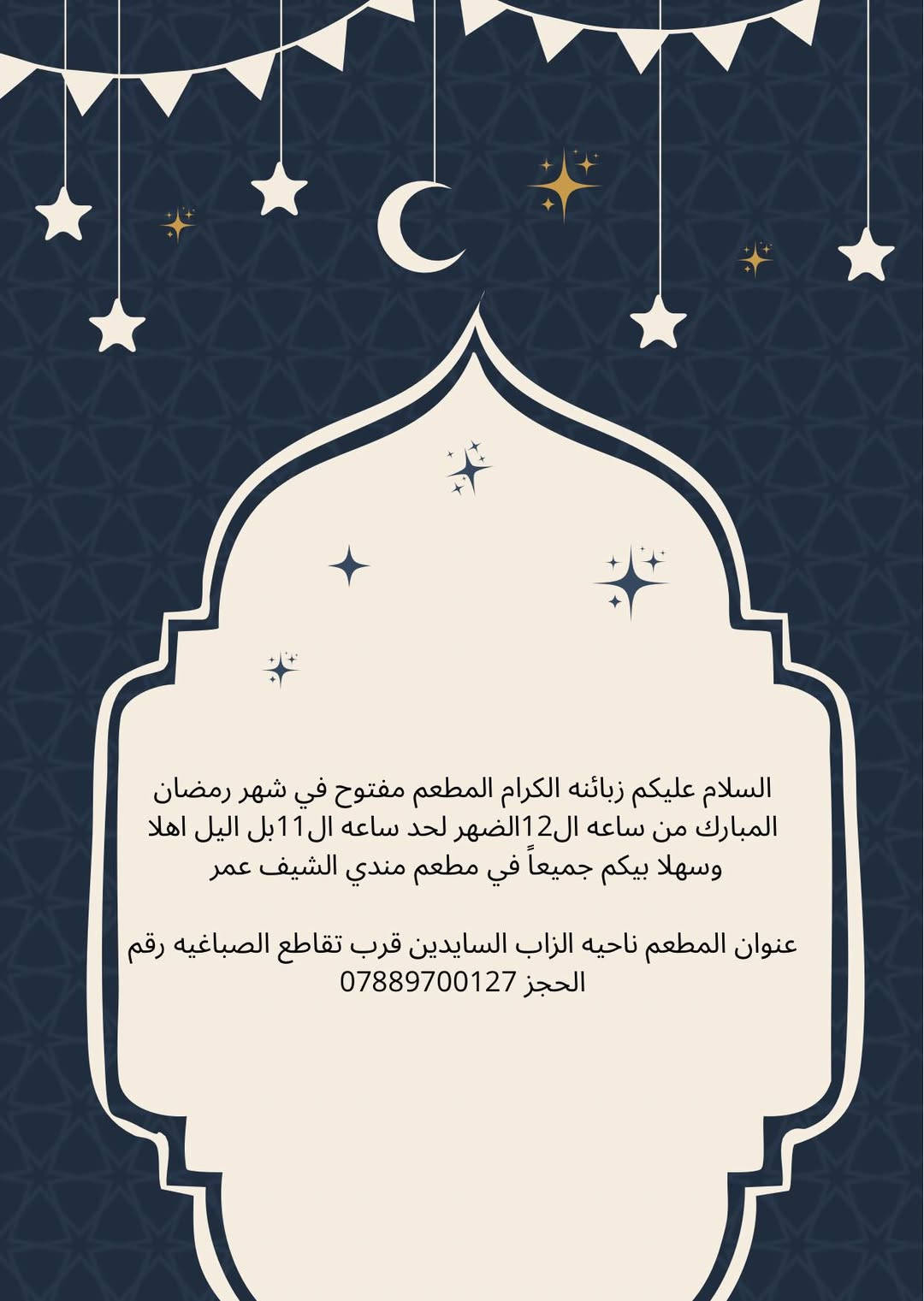اهلا وسهلاً بيكم في مطعم مندي الشيف عمر المطعم مفتح في شهر رمضان المبارك اللهم نسألك ان ترزقنه وترزق الجميع يارب **إذا كنت صاحب هذا الإعلان وتريد حذفه لأي سبب، رجاءا أرسل رسالة إلى الدعم الفني**