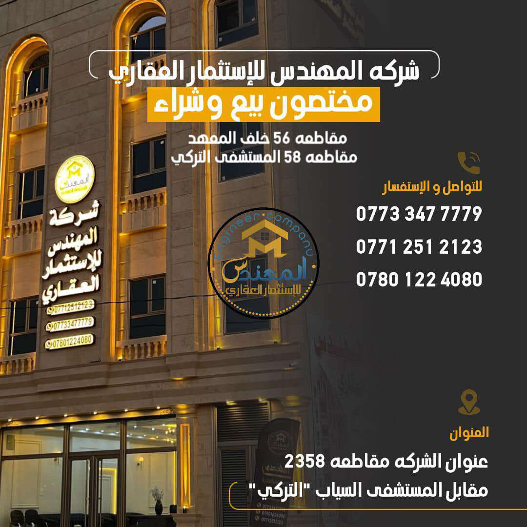 تعلن شركة المهندس للاستثمار العقاري عن فرص مميزة لبيع وشراء قطع الأراضي مقابل المستشفى التركي 2358 وخلف المعهد2356والصبخ والاساتذة والبلدية وياسين خريبط وجميع مناطق البصرة الطابو نتميز بضمان استثمار أموالك في العقار الصحيح، وتقديم الاستشارات العقارية المتخصصة. وتتميز المنطقة بقربها الجغرافي من مركز البصرة والمشاريع العملاقة التي ستنطلق بها مثل الابراج والمدن السكنية المميزة والجسر الرابط بين المطار وشارع عبدالله عويز والكثير من المشاريع للمزيد من المعلومات والاستفسارات، قم بالتواصل معنا. *********** *********** ***********
