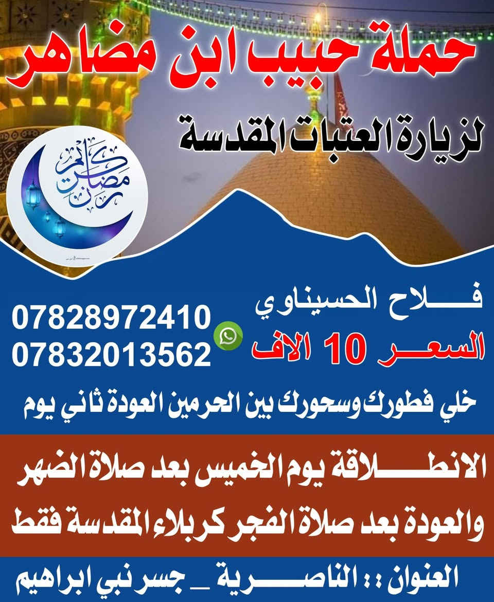 خلي فطورك وسحورك بكربلاء المقدسه نطلاقه يوم الخميس بعد صلاة الظهر والعوده ثاني يوم بعد صلاة الفجر بسعر 10الف حجز واتساب *********** خادمكم فلاح الحسيناوي ناصرية, ذي قار