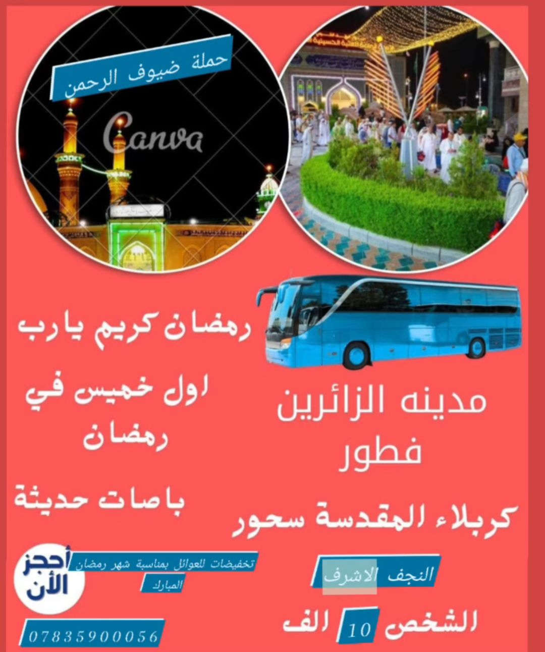 #حملة #ضيوف #الرحمن رمضان كريم يارب أول خميس من شهر رمضان المبارك 🌙 مدينه الزائرين 🎆 كربلاء فطور وسحور 🕌 النجف الاشرف 🕌 سارعو بالحجز المقاعد محدوده للحجز للاستفسار يرجى مرسله الصفحة او واتس *********** المكتب *********** قسم شركه