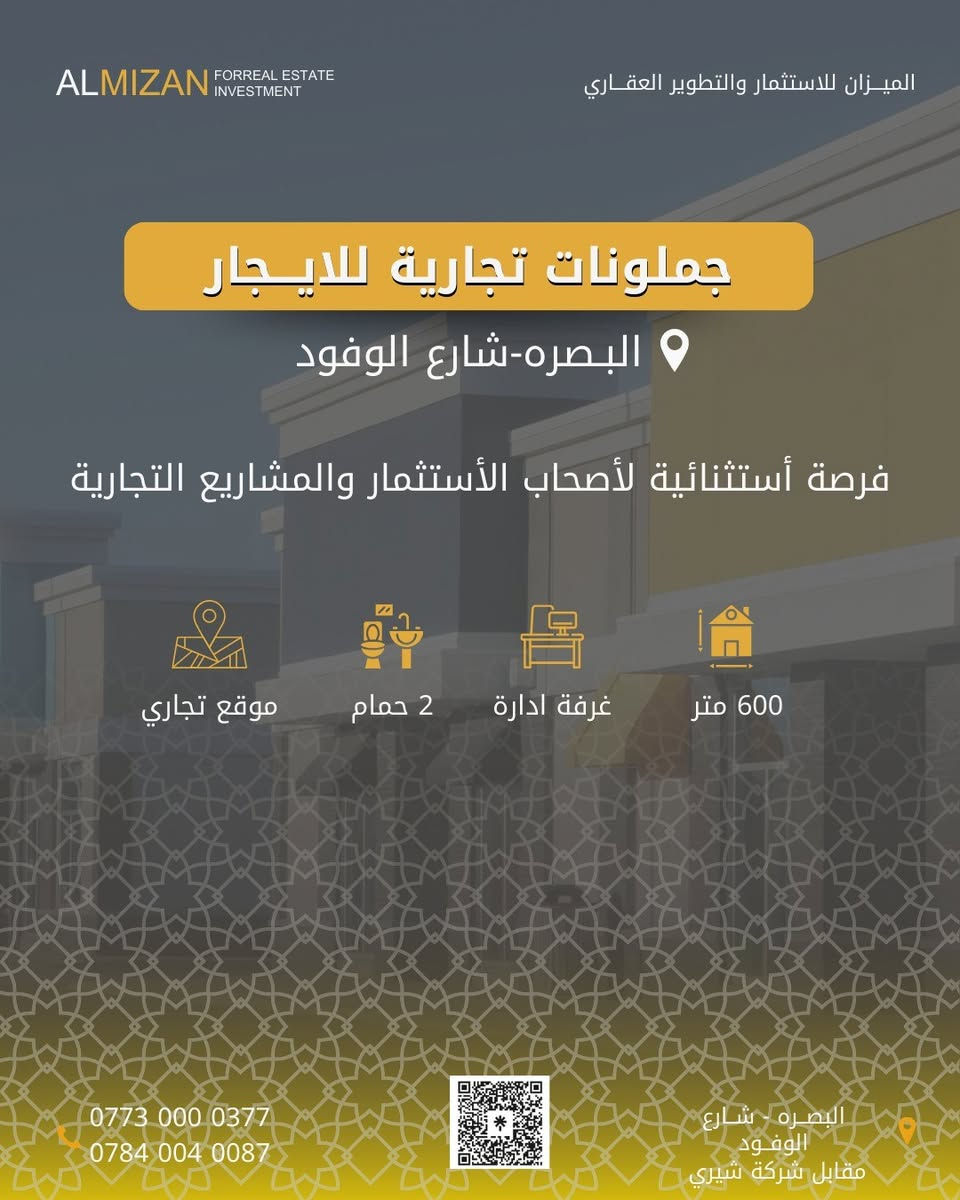 ⚖️ الـمـيـزان للاسـتثمـار والتطوير الـعقـاري ⚖️ 📌 جملونات عدد 2 للايجار - البصرة / شارع الوفود 🔸 التفاصيل : مساحة الجملون الواحد : 600 متر موقع جدا مميز مجهز بالكامل بغرفة ادرة صحيات عدد 2 حراسة تلائم لأصحاب المشاريع التجارية الباحثين عن موقع استراتيجي مثالي لتنفيذ أعمالهم 🔸بدل ايجار الجملون الواحد : مليونين دينار عراقي (قابل للتفاوض) الميزان للاستثمار العقاري - نعمل بجد لتقديم أفضل العروض العقارية لكم. ⚖️⚖️⚖️⚖️⚖️⚖️⚖️⚖️⚖️⚖️ 🔹الفيس بوك (https://www.facebook.com/profile.php?id=61552046311066&mibextid=LQQJ4d) 🔹الانستكرام https://www.instagram.com/almizan_iq?igsh=MWl5ZzVqZTBkYTJobQ== 🔹التليجرام almezan_real 🔹التيك توك https://www.tiktok.com/@almezan_real?_t=8hFjVbhQp2z&_r=1 السوق المفتوح ( الميزان للاستثمار العقاري ) 🔶 أرقام المكتب *********** *********** *********** 📌البصرة - شارع الوفود - مقابل معرض شيري للسيارات