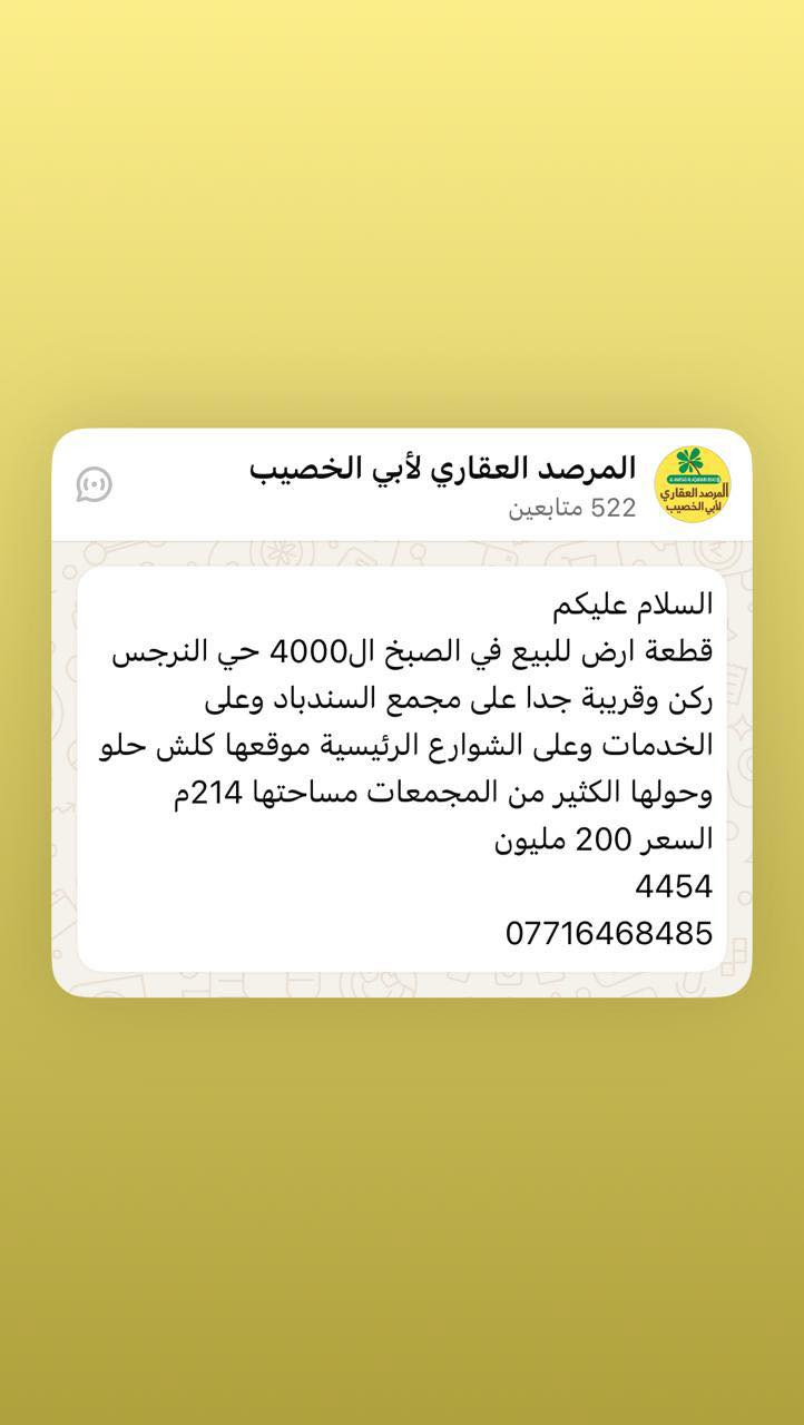 السلام عليكم قطعة ارض للبيع في الصبخ ال4000 حي النرجس ركن وقريبة جدا على مجمع السندباد وعلى الخدمات وعلى الشوارع الرئيسية موقعها كلش حلو وحولها الكثير من المجمعات مساحتها 214م السعر 200 مليون 4454 ***********