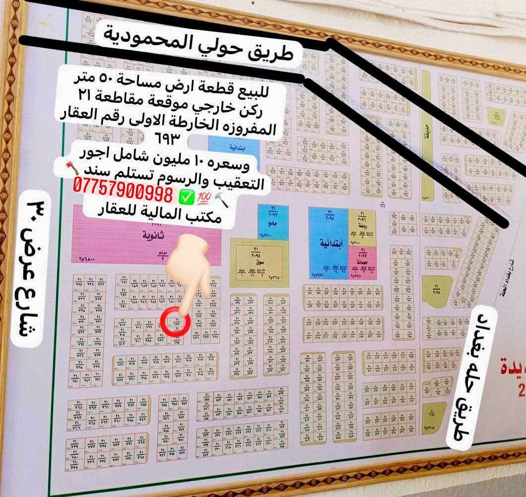 عقار رخيص للاستثمار 💯💯💯✅ للبيع قطعة ارض مساحة ٥٠ متر ركن خارجي موقعة مقاطعة ٢١ المفروزه على حولي المحمودية الخارطة الاولى رقم العقار ٦٩٣ وسعره ١٠ مليون شامل اجور التعقيب والرسوم تستلم سند 🪓 🔨💯✅*********** مكتب المالية للعقار