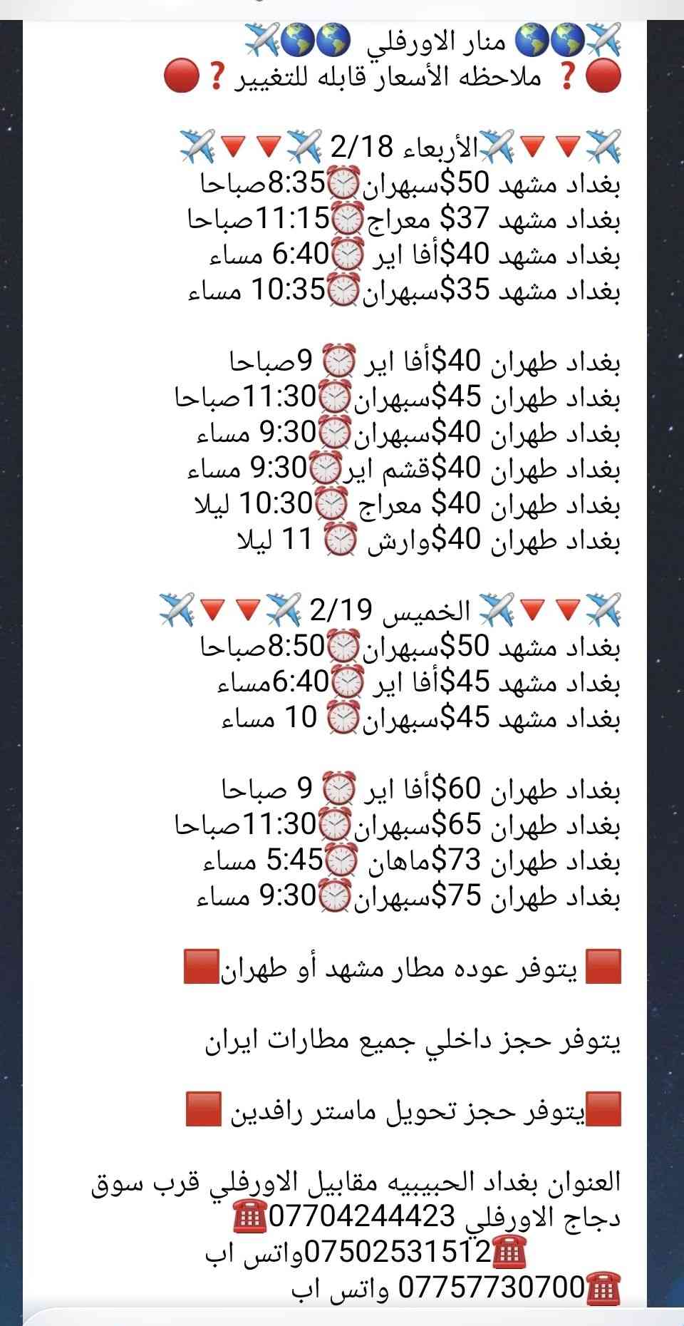 ✈️🌎🌎 منار الاورفلي 🌎🌎✈️ 🔴❓️ ملاحظه الأسعار قابله للتغيير❓️🔴 ✈️🔻🔻✈️الأربعاء 2/18 ✈️🔻🔻✈️ بغداد مشهد 50$سبهران⏰️8:35صباحا بغداد مشهد 37$ معراج⏰️11:15صباحا بغداد مشهد 40$أفا اير ⏰️6:40 مساء بغداد مشهد 35$سبهران⏰️10:35 مساء بغداد طهران 40$أفا اير ⏰️ 9صباحا بغداد طهران 45$سبهران⏰️11:30صباحا بغداد طهران 40$سبهران⏰️9:30 مساء بغداد طهران 40$قشم اير⏰️9:30 مساء بغداد طهران 40$ معراج ⏰️10:30 ليلا بغداد طهران 40$وارش ⏰️ 11 ليلا ✈️🔻🔻✈️ الخميس 2/19 ✈️🔻🔻✈️ بغداد مشهد 50$سبهران⏰️8:50صباحا بغداد مشهد 45$أفا اير ⏰️6:40مساء بغداد مشهد 45$سبهران⏰️ 10 مساء بغداد طهران 60$أفا اير ⏰️ 9 صباحا بغداد طهران 65$سبهران⏰️11:30صباحا بغداد طهران 73$ماهان ⏰️5:45 مساء بغداد طهران 75$سبهران⏰️9:30 مساء 🟥 يتوفر عوده مطار مشهد أو طهران🟥 يتوفر حجز داخلي جميع مطارات ايران 🟥يتوفر حجز تحويل ماستر رافدين 🟥 العنوان بغداد الحبيبيه مقابيل الاورفلي قرب سوق دجاج الاورفلي ***********☎️ ☎️***********واتس اب ☎️*********** واتس اب