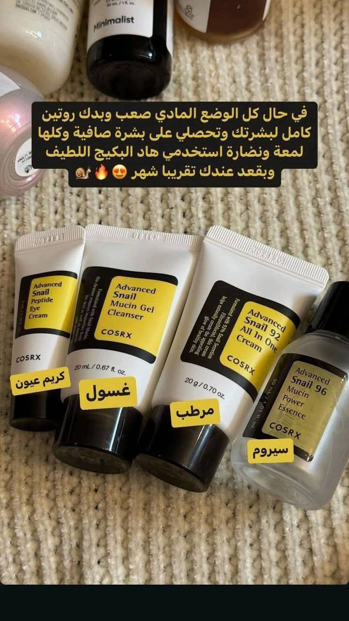 بكج الحلزون من COSRX 🐌✨ عناية متكاملة بتركيبة مخاط الحلزون لترطيب عميق، إصلاح البشرة، وتخفيف آثار الحبوب 💧💕 يمنح بشرتك نعومة، إشراقة ومرونة من أول استخدام. مثالي للبشرة المتعبة والجافة ويخليها تبين أنعم وأنقى بشكل ملحوظ 👌 السعر عالخاص **إذا كنت صاحب هذا الإعلان وتريد حذفه لأي سبب، رجاءا أرسل رسالة إلى الدعم الفني**