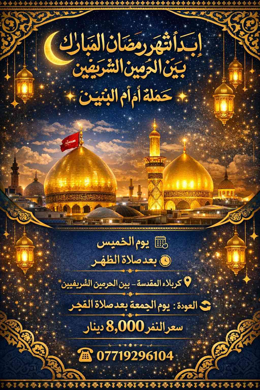 🌙 ابدأ شهر رمضان المبارك بين الحرمين 🌙 ✨ حملة أم البنين (ع) ✨ 🗓 يوم الخميس ⏰ بعد صلاة الظهر 📍 كربلاء المقدسة – بين الحرمين الشريفين 🔁 العودة: يوم الجمعة بعد صلاة الفجر 💰 سعر النفر: 8,000 دينار 📞 للحجز والاستفسار: ***********