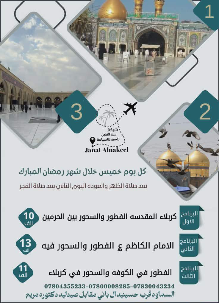 #كل_يوم_خميس_بعد_صلاه_الضهر_والعوده_اليوم_الثاني_بعد_صلاه_الفجر #بمناسبة_شهر_رمضان_المبارك رحلات خاصة للعوائل الى كربلاء المقدسة _ الكاظميه المقدسة 🌙استمتع بأجواء رمضان. الروحانيه مع عائلتك في رحلة الى كربلاء + الكاظمية - حيث لحظات إيمانيه لا تنسى وافطار بين الحرمين ___ ⏱️ #موعد_رحلة_كل_خميس_بعد_صلاة_الظهر 📍. برنامج الاول. الى #كربلاء_المقدسة. 🍽️إفطار وسحور رمضاني بين الحرمين.سعر ( 10 الف ) البرنامج الثاني 🍽️ الى بغداد إفطار وسحور. قرب الامام الكاظم. ع سعر ( 13 الف ) البرنامج لثالث 🍽️ الكوفة فطور كربلاء سحور (11 الف) 🌠 اهتمام خاص بالزائرين واجواء هادئة *العودة اليوم الثاني بعد صلاة الفجر شركة جنة النخيل للسفر والسياحة الزيارت العتبات المقدسة 📍موقعنا السماوة . _ ال بأني مقابيل صيدليه دمريم للحجز والاستفسار *********** 📞 واتساب إتصال *********** 📞 واتساب اتصال *********** 📞 واتساب اتصال