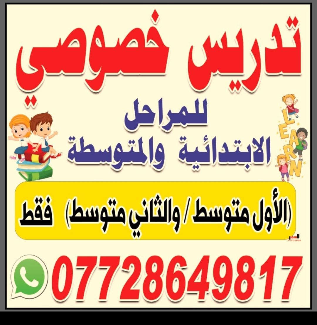 (بسم الله الرحمن الرحيم) يَرْفَعِ اللَّهُ الَّذِينَ آمَنُوا مِنكُمْ وَالَّذِينَ أُوتُوا الْعِلْمَ دَرَجَاتٍ وَاللَّهُ بِمَا تَعْمَلُونَ خَبِيرٌ”... (صدق الله العلي العظيم) السلام عليكم 📚 تدريس خصوصي 📚 مستواك الدراسي يهمنا 📚 ✅ تدريس خصوصي لجميع المراحل (الابتدائيه) ✅تدريس خصوصي لمراحل المتوسطه لصف(الاول متوسط/الثاني متوسط ) ✅شرح مبسط + تدريب مكثفه + متابعه مستمرة ✅تضمن المحاضرات (متابعه الطالب + امتحانات يوميه + امتحانات شهرية + متابعة واجباته وامتحاناته في المدرسة وايضاً التواصل المستمر مع اهل الطالب لمعرفة التقديم في مستواه الدراسي ) ✅ رفع مستواك وضمان فهمك 🥰 ✅شرح مفصل لجميع المواد و لجميع المراحل 🥰 ✅نستقبل الحقيبه الكامله و الدروس المفرده وبأسعار مناسبه جداً 🥰 ✅للإستفسار و الحجز المراسلة على الوتساب *********** ✅العنوان شهداء البياع (شارع سوق رضا مقابل الفرع 3)