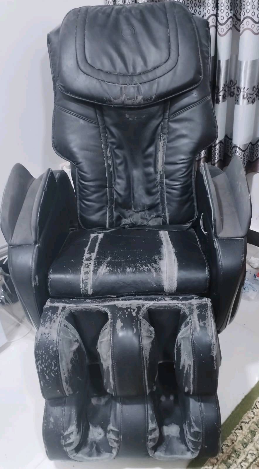 كرسي مساج نظافته 70% شغال جميع مواصفاته يحتوي على اكثر من مود للتدليك و الاهتزاز ، من الممكن ان يصبح مستوي بدرجة 180 يحتوي على ثقوب بسبب القطة ايضا الطبقة الخارجية متقشرة قليلاً
