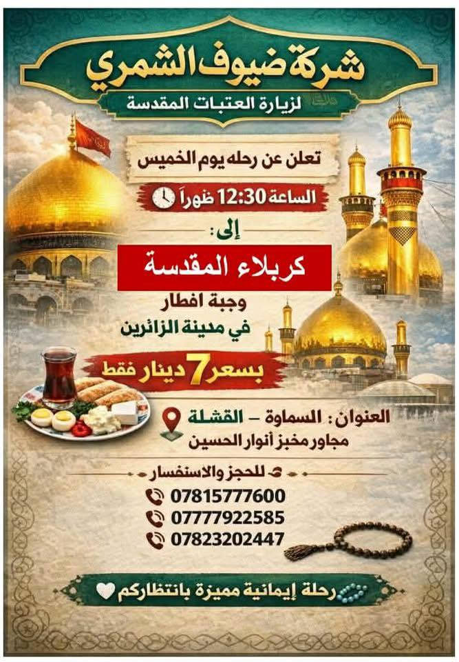 شركه ضيوف الشمري عرض خاص بناسبه قدوم شهر رمضان اول خميس برمضان ب7الاف فقط مدينه زائرين.فطور وذهاب الى كربلاء #السماوة #السماوه **إذا كنت صاحب هذا الإعلان وتريد حذفه لأي سبب، رجاءا أرسل رسالة إلى الدعم الفني**