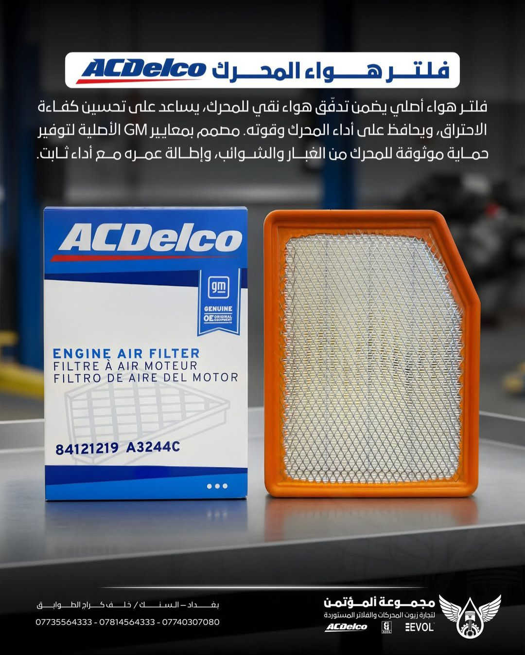 سلام وعليكم .. اطلب فلتر هواء المحرك الاصلي ... من ACDelco. اترك الكوبي وابقى مع الاصلي حتى تحافظ على ديمومة المحرك اطلب المنتج من الوكاله ...او من.. مجموعة المؤتمن لتجارة زيوت المحركات والفلاتر المستوردة الوكيل الرسمي لشركة المنصور العراقية للسيارات وشركة ACDelco في العراق .... بغداد /السنك / خلف كراج الطوابق ***********/ ***********/ ***********