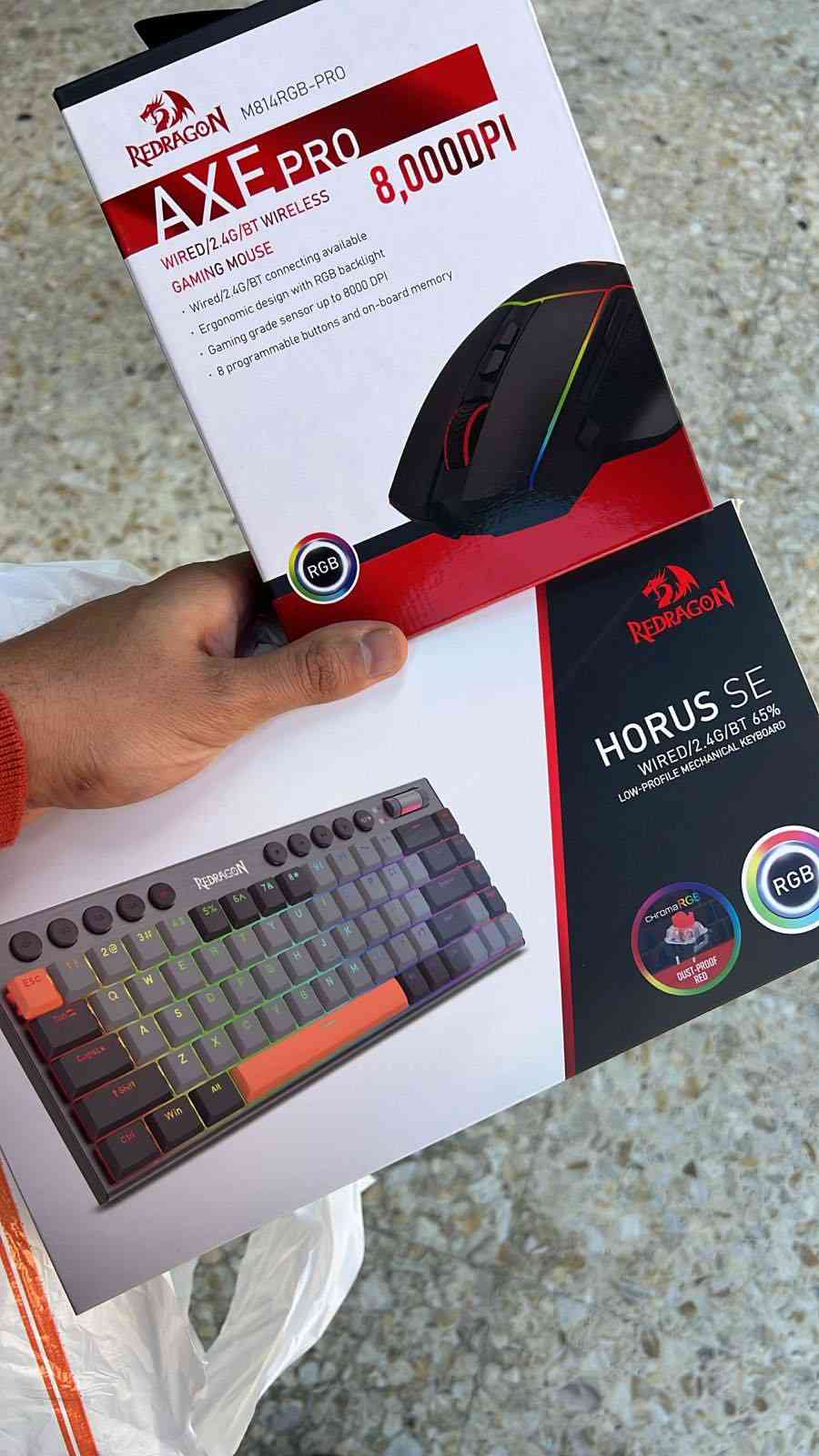 كيبورد وماوس شركة REDRAGON الشركة غنية عن التعريف ويشتغلون بثلاث طريق بلوتوث ولاسلكي وسلكي رايدهم ب 65 الف شامل التوصيل اخذتهم قبل فترة ب 90 الف ***********