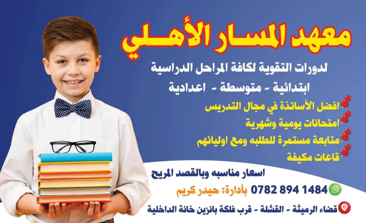 صعد درجتك واضمن دخولك بالوزاري واذا مرحله غير منتهيه تعال ويانا وخلي سعيك يصعد 😉👍 ⏳ اختصر الوقت 💪 قلل الجهد 💰 وفر التكلفة وانضم ويانا اليوم ✅ 🔺 أسعارنا الأنسب ✅ 🔺 وأداؤنا هو الأفضل بأسلوب فريد وطريقة مميزة ومراجعة متقنة تساعد الطالب على: ✔️ الحصول على أفضل الدرجات ✔️ اختصار الوقت والجهد ✔️ تقليل المبالغ الكبيرة 🎓 جميع المراحل متوفرة: 🔵 الابتدائي الأول + الثاني حتى السادس الابتدائي 🔵 المتوسط الأول + الثاني حتى الثالث متوسط 🔵 الإعدادي الرابع + الخامس حتى السادس الإعدادي 🔵 المهني المهني + إعدادية الصناعة 📍 موقعنا: الرميثه – القشله – شارع الجنابات قرب فلكه بانزين خانه الداخليه 📱 للاستفسار: *********** معهد المسار الاهلي