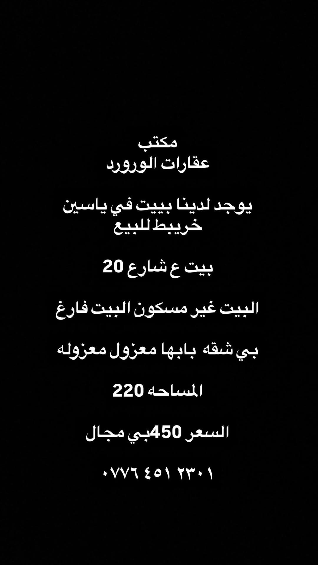 مكتب عقارات الورورد يوجد لدينا بييت في ياسين خريبط للبيع بيت ع شارع 20 البيت غير مسكون البيت فارغ بي شقه بابها معزول معزوله المساحه 220 السعر 450بي مجال ٠٧٧٦ ٤٥١ ٢٣٠١