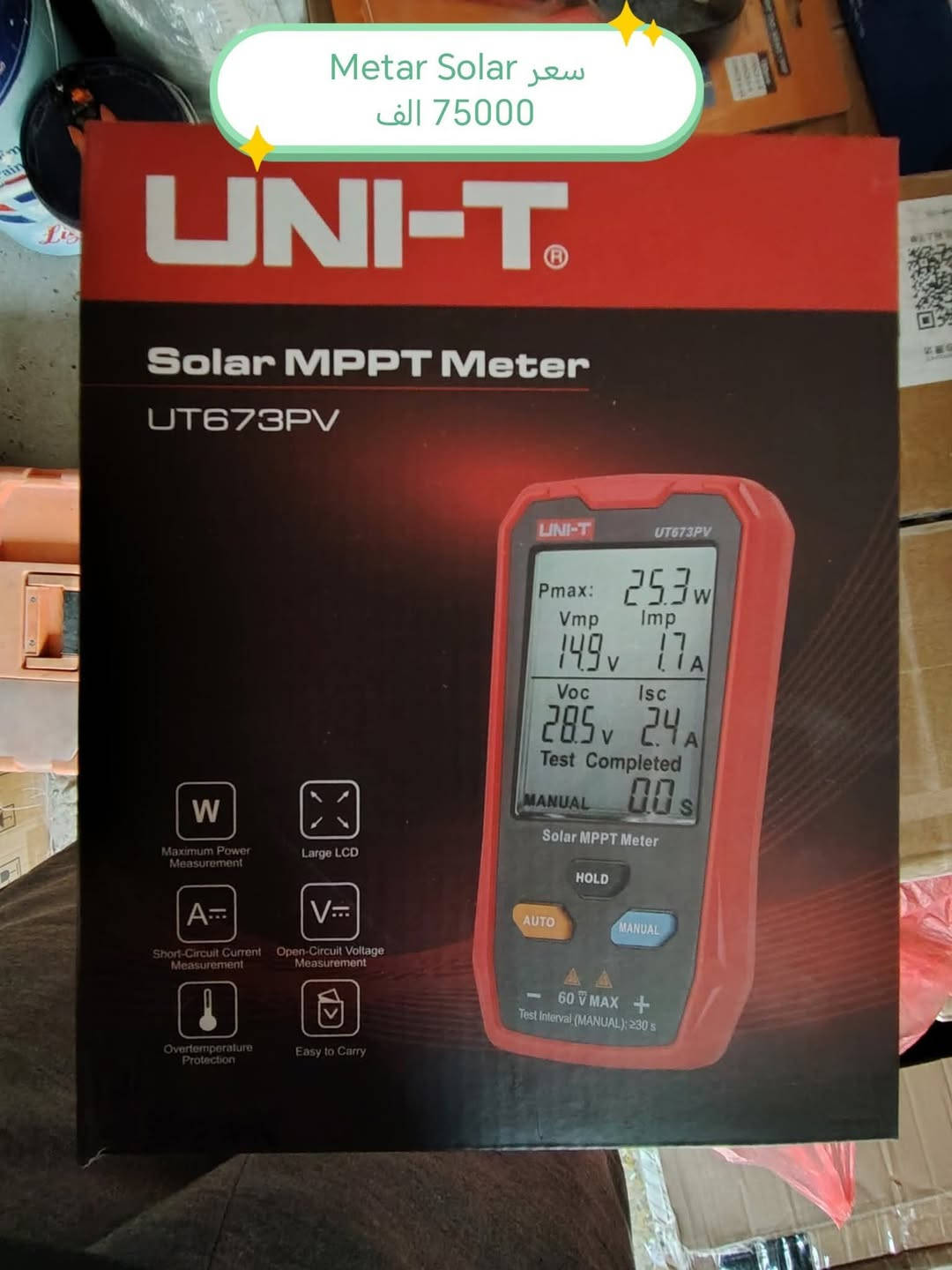 السعر: 60 ألف الوظيفة: قياس الحد الأقصى للطاقة (Pmax)، جهد الدائرة المفتوحة (Voc)، وتيار الدائرة القصيرة (Isc) للألواح الشمسية الكهروضوئية. المميزات: يدعم اختبار الألواح حتى 800 واط، ويحتوي على شاشة LCD كبيرة وحماية من الحرارة الزائدة. الاستخدام: سهل الحمل ومناسب للفنيين ومركبي الألواح الشمسية لتقييم أداء الأنظمة بسرعة. **إذا كنت صاحب هذا الإعلان وتريد حذفه لأي سبب، رجاءا أرسل رسالة إلى الدعم الفني**