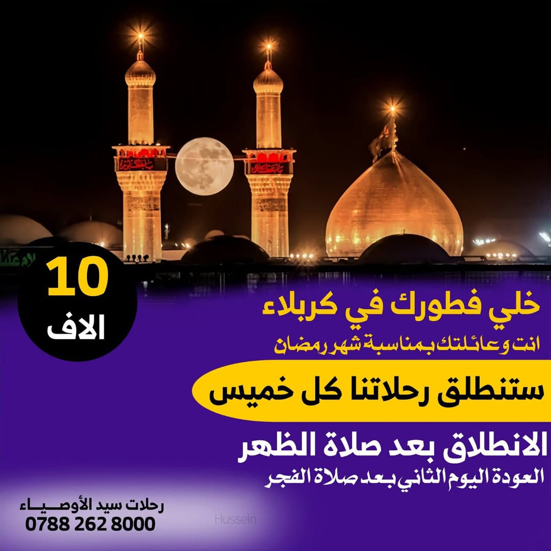 #كل_يوم_خميس_بعد_صلاه_الضهر_والعوده_اليوم_الثاني_بعد_صلاه_الفجر #بمناسبة_شهر_رمضان_المبارك رحلات خاصة للعوائل الى كربلاء المقدسة 🌙استمتع بأجواء رمضان. الروحانيه مع عائلتك في رحلة الى كربلاء حيث لحظات إيمانيه لا تنسى وافطار بين الحرمين ___ ⏱️ #موعد_رحلة_كل_خميس_بعد_صلاة_الظهر 📍الى #كربلاء_المقدسة 🍽️افطار رمضاني بين الحرمين 🚎 نقل حديث ومكيف لضمان راحتكم 🌠 اهتمام خاص بالزائرين واجواء هادئة *العودة اليوم الثاني بعد صلاة الفجر السعر 10, الاف فقط #ذهابا_وايابا 📍موقعنا الناصرية. _مركز المدينة _وسوق الشيوخ للحجز والاستفسار ***********📞 واتساب تيليجرام إتصال ***********📞 واتساب تيليجرام اتصال