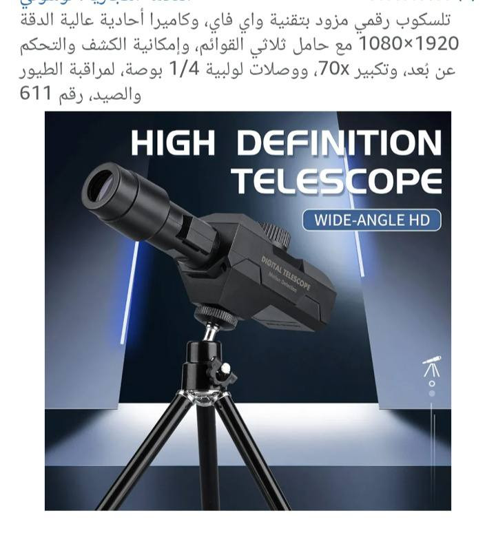 ناضور وايفاي يعرض عله موبايل تلسكوب عالي الدقة 1920 × 1080: الحد الأقصى لدقة فيديو التلسكوب هو 1920 × 1080، بينما تبلغ دقة الكاميرا 1600 × 1200. التشغيل بسيط، كما يُمكن تصوير الفيديو عن بُعد. الكشف عن الأجسام المتحركة والتحكم بها: عندما يظهر الجسم المعني (أشخاص، حيوانات، سيارات، إلخ) أو يتحرك في المسافة، سيصدر صوت تحذير وسيتم تشغيل التخزين التلقائي للفيديو. تكبير 70x: يُستخدم زر دائري واحد للتركيز، مما يجعل التحكم أكثر سهولة. يدعم التلسكوب تكبيرًا يصل إلى 70x لرؤية المزيد من التفاصيل. وظائف عملية: يحمي غطاء الغبار العدسة من الخدوش، مما يضمن رؤية أفضل. يمكن تعديل رأس المنظار متعدد الوظائف في اتجاهات متعددة لتسهيل الحركة والبحث عن الأهداف. يدعم أنظمة iOS وأنظمة التشغيل الأخرى. تطبيقات واسعة: التلسكوب الرقمي مناسب للبالغين ومناسب لمراقبة الطيور والصيد والمشي لمسافات طويلة والتخييم والسفر والحياة البرية والمناظر الطبيعية وغيرها من المجالات توصيل لجميع المحافظات العراق 🇮🇶 **إذا كنت صاحب هذا الإعلان وتريد حذفه لأي سبب، رجاءا أرسل رسالة إلى الدعم الفني**