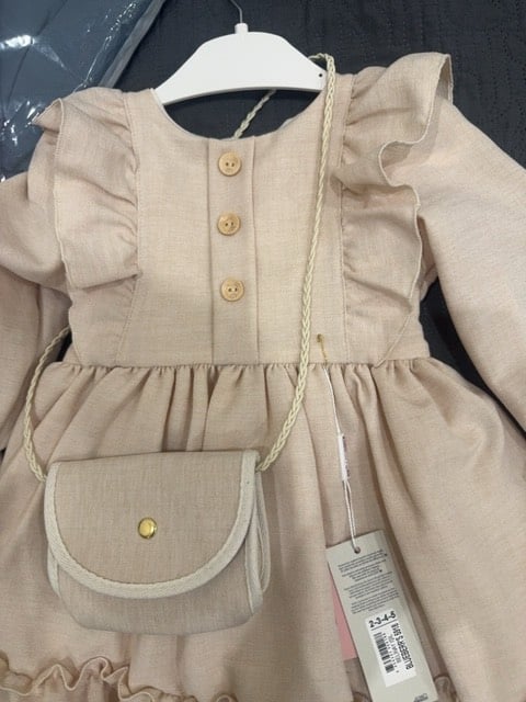 فستان بناتي بتصميم جميل مع حقيبة صغيرة مرفقة. لونه بيج ونسيجه ناعم، مثالي للمناسبات الخاصة. الأزرار الأمامية تضيف له لمسة أنيقة. متوفر بمجموعة مقاسات للأطفال.