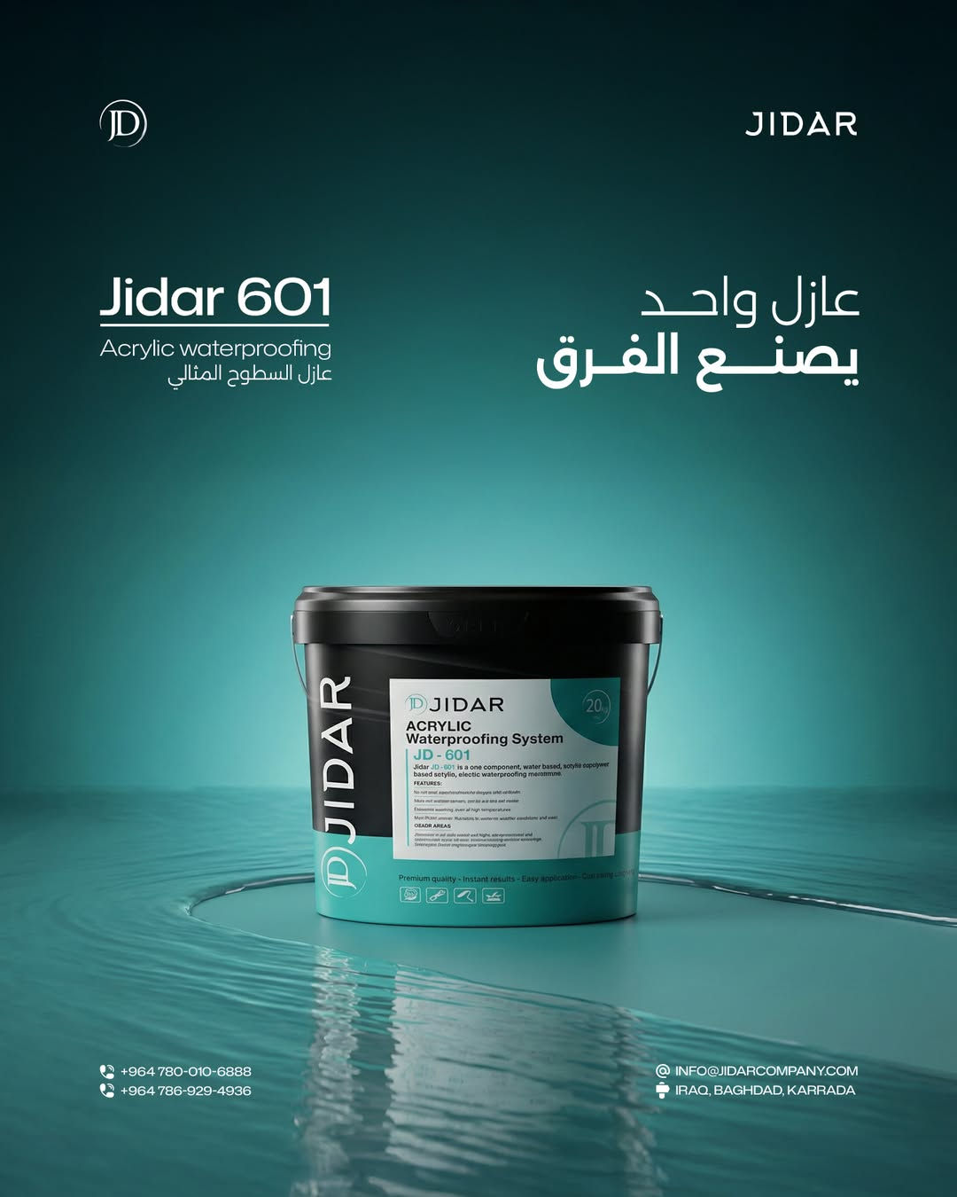 عندما تتساوى المواد تبقى الجودة هي الفاصل الحقيقي Jidar ®️ 601 العازل المائي عالي الكفاءة يشكل حاجزًا متينا يمنع تسرب المياه ويحمي الأسطح من أضرار الأمطار والرطوبة. حل موثوق صمم ليصمد حيث تفشل الحلول التقليدية Building Better Together, The #JIDAR way للحجز و الاستفسار مركز المبيعات الرئيسي *********** - *********** [email protected]