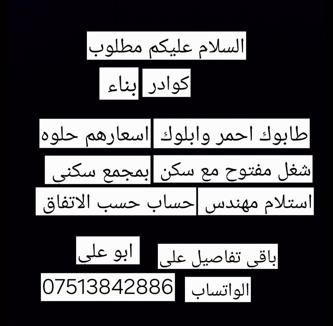السلام عليكم استلمت موقع شغل مفتوح مع سكن ابوغريب محتاجين كوادر بناء ابلوك وطابوك احمر واتساب ***********