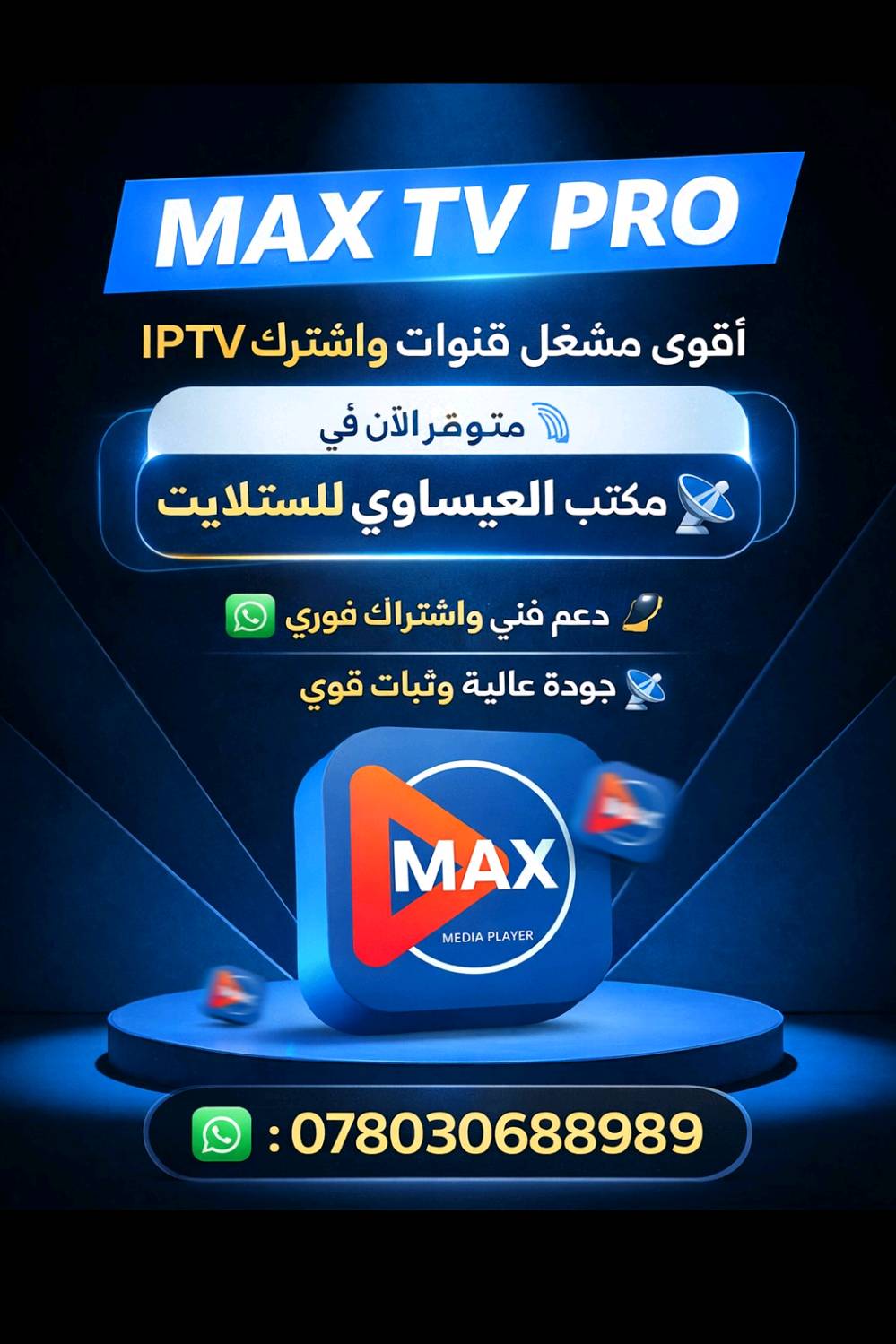 أقدم لكم MAX TV PRO 📺، أقوى مشغل قنوات IPTV 📡. يتوفر الآن في مكتب العيساوي للستلايت مع دعم فني واشتراك فوري 💬. يوفر جودة عالية وثبات قوي.