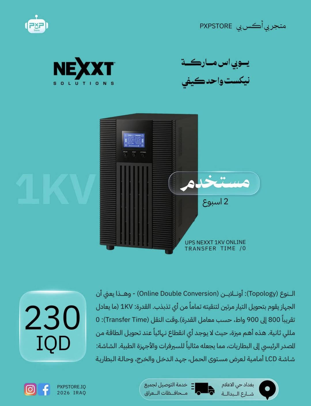 السلام عليكم ، UPS مستخدم ل اسبوعين فقط نظيف ١٠٠٪ ، اونلاين ، القدرة 1kv ، يشغل pc و ps4/5 و شاشة، ب 230 الف الملحقات كاملة و التوصيل مجاني **إذا كنت صاحب هذا الإعلان وتريد حذفه لأي سبب، رجاءا أرسل رسالة إلى الدعم الفني**