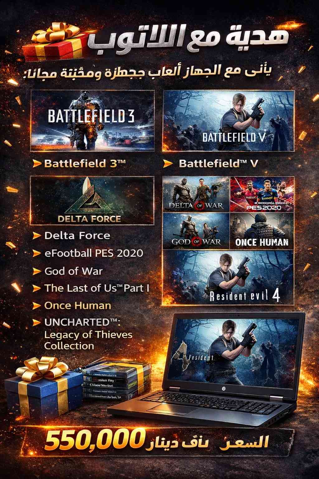 مراوس بايفون 13 برو ماكس او 14 عادي او ايفون 12 برو ماكس ⚙️ المعالج: Intel Core i7 🧠 الرام: 16GB RAM 💾 التخزين: 512GB SSD 🎮 كرت الشاشة: NVIDIA Quadro M2000M 🖥 الشاشة: 17 إنج Full HD 🎁 هدية مع الجهاز ألعاب جاهزة: Battlefield 3 Battlefield V eFootball PES 2020 God of War Resident Evil 4 The Last of Us Part I 💰 السعر: 550,000 دينار فقط 📍 الموقع: بغداد – الحرية **إذا كنت صاحب هذا الإعلان وتريد حذفه لأي سبب، رجاءا أرسل رسالة إلى الدعم الفني**
