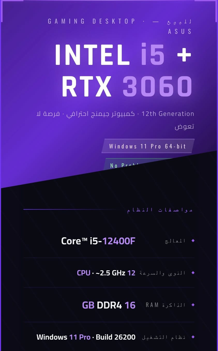 السلام عليكم ( من رخصة اخواننا الادمن) تجميعه كامله وهاي مواصفاتها المهتم يراسلني خاص ادزله السعر. المعالج intel i5 12400F الرامات 16 GB DDR4 كارت الشاشه 3060 RTX 12 GB البور سبلاي 650 W الهارد 1T SSD الCPU 2.5GHz 12 **إذا كنت صاحب هذا الإعلان وتريد حذفه لأي سبب، رجاءا أرسل رسالة إلى الدعم الفني**