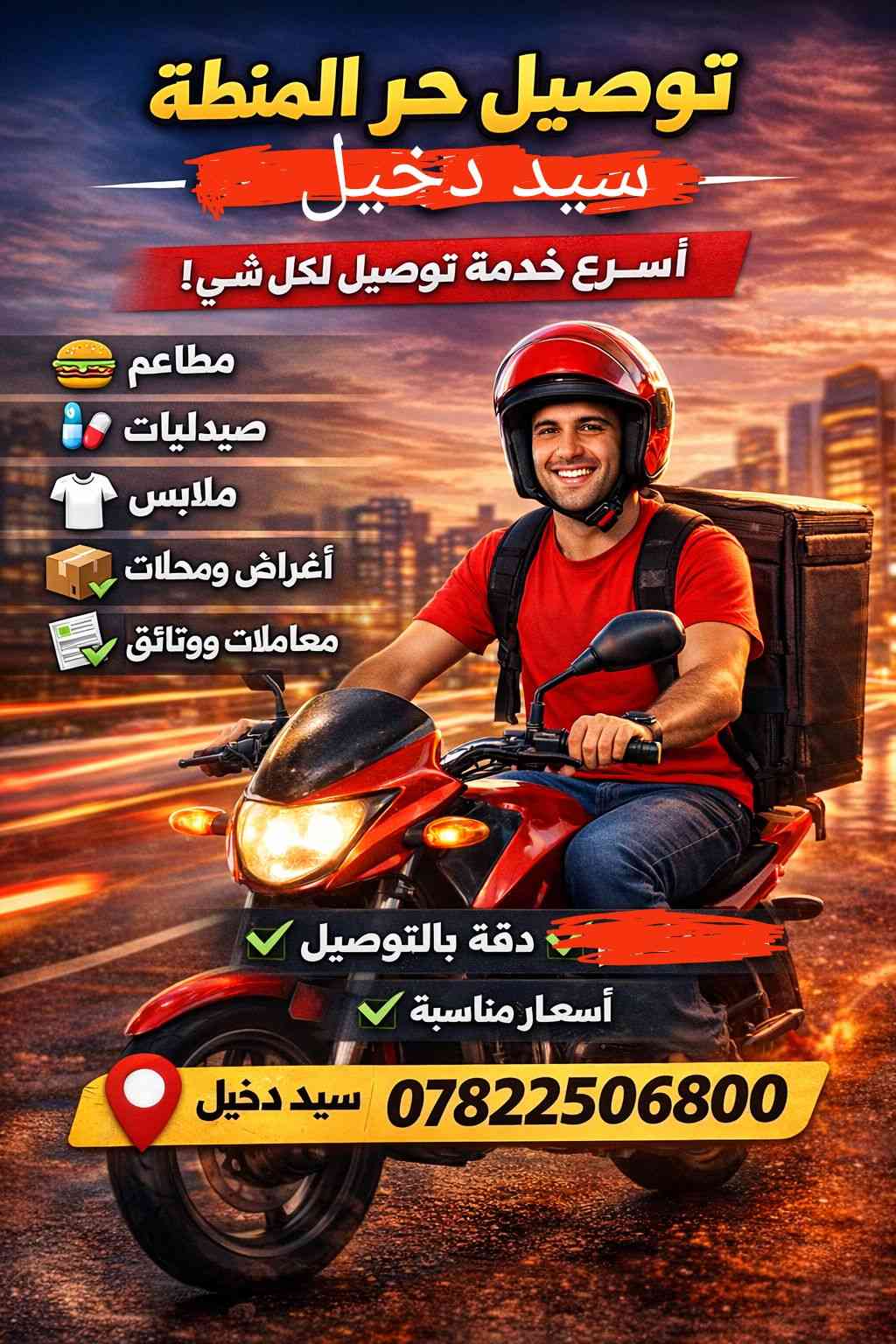 🚴♂️ توصيل حر داخل منطقة سيد دخيل 🚴♂️ أوفر خدمة توصيل سريعة وآمنة لكل شي: 🍔 مطاعم 💊 صيدليات 👕 ملابس 📦 أغراض ومحلات 📄 معاملات ووثائق ✅ سرعة بالتوصيل ✅ التزام ودقة ✅ أسعار مناسبة 📍 التوصيل داخل منطقة سيد دخيل 📞 للتواصل: (***********)