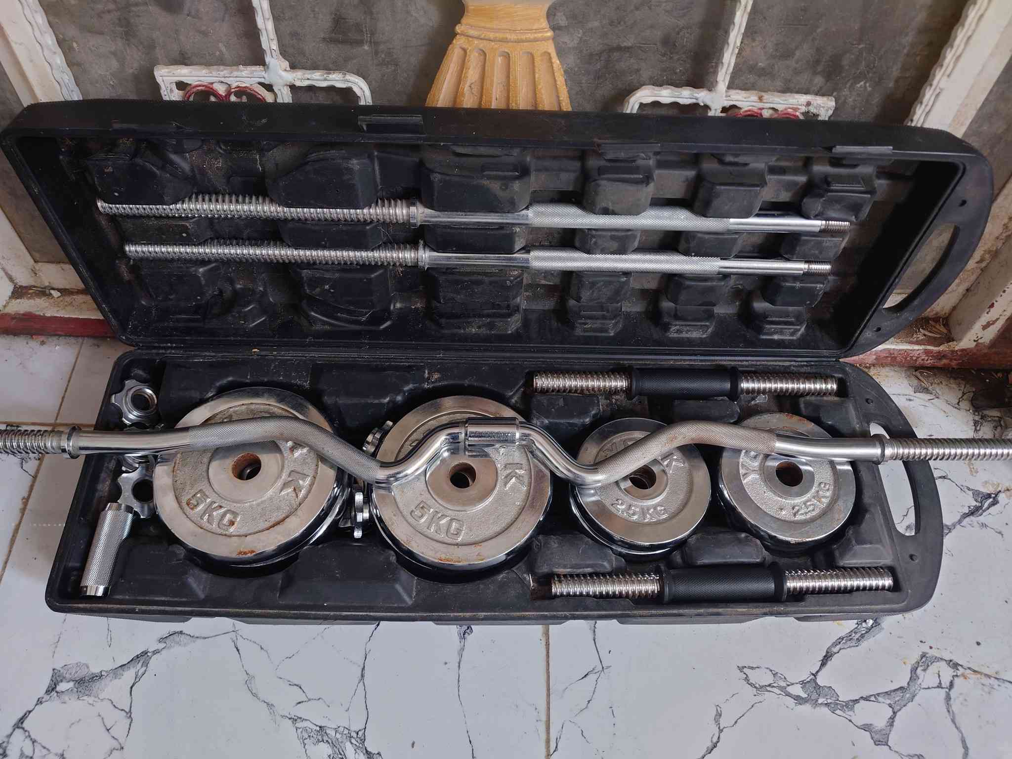 تجهيزه حديد كامله متكونه من دمبلص اثنين بار طويل بار w 55 كيلو 150 ***********
