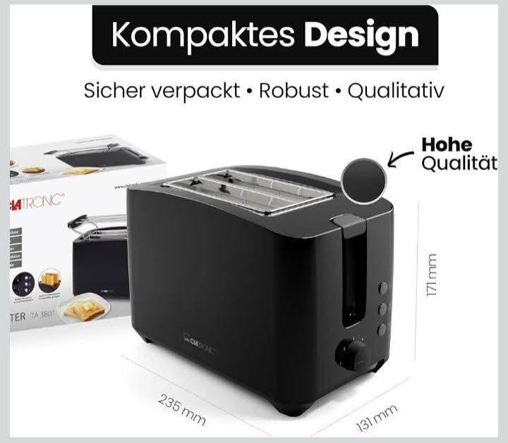 محمصة خبز من العلامة التجارية Clatronic، طراز TA 3802. تتميز بقدرة على تحميص 4 شرائح في وقت واحد بفضل الفتحات الطويلة. تحتوي على خاصية "Cool Touch" لتبقى الجوانب باردة أثناء الاستخدام. تتضمن وظائف لإذابة الثلج، إعادة التسخين، والإيقاف السريع، مع مؤشرات LED للتحكم. تأتي مع درج مخصص لتجميع فتات الخبز لسهولة التنظيف. سعر المنتج 40 الف دينار فقط. **إذا كنت صاحب هذا الإعلان وتريد حذفه لأي سبب، رجاءا أرسل رسالة إلى الدعم الفني**