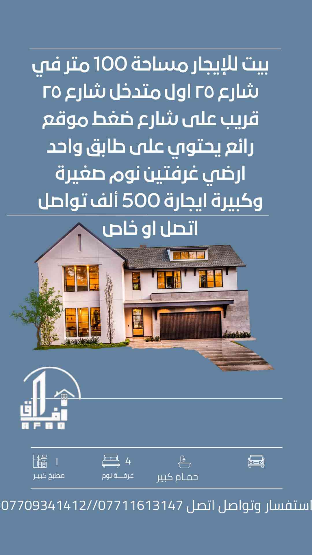 بيت للإيجار بمساحة 100 متر 📍 عنوان : حي دجلة شارع ٢٥ قريب على شارع ضغط يحتوي على طابق واحد غرفتين نوم واستقبال وحمام تواصل :***********//***********