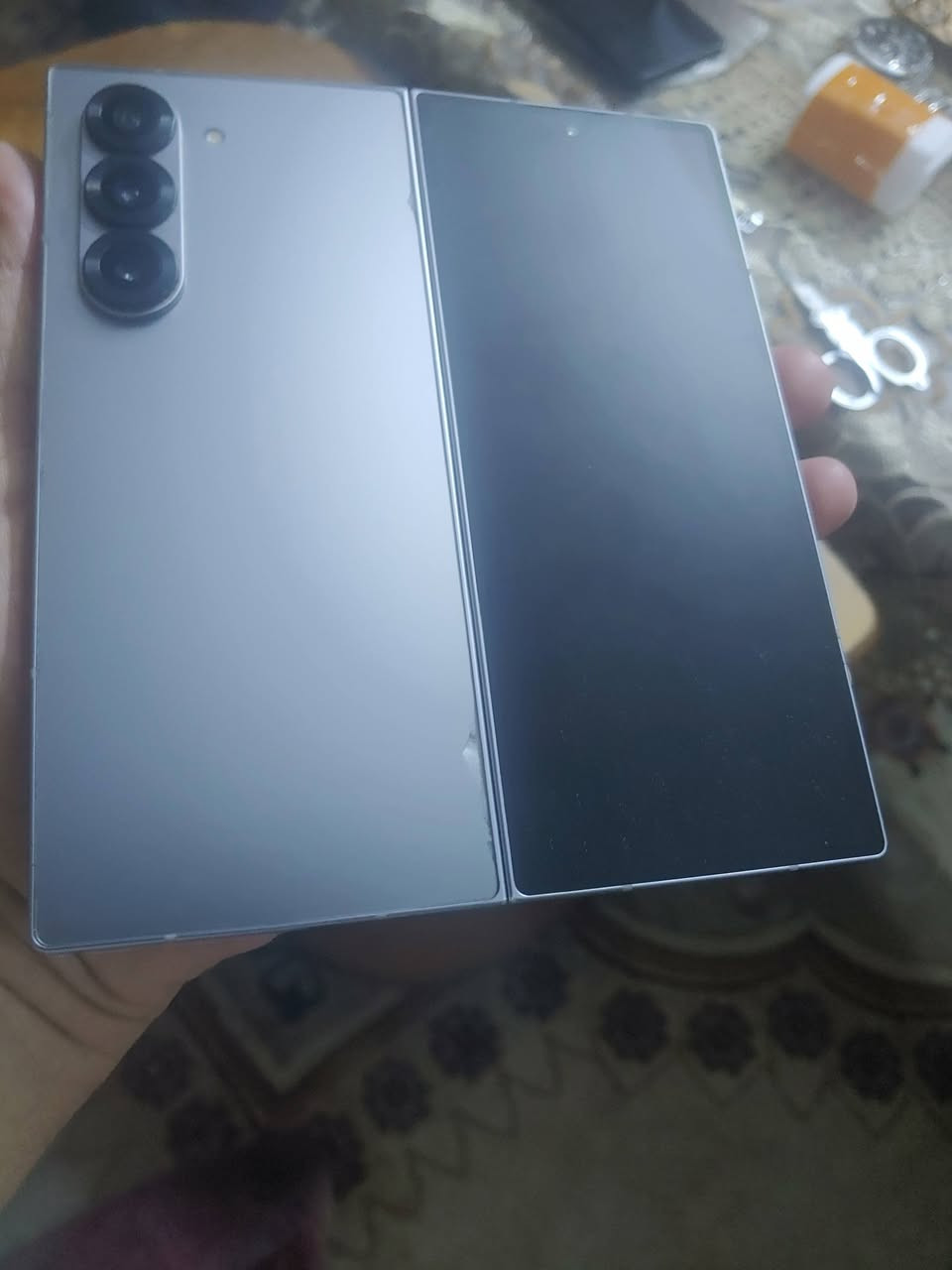 سامسونك فولد 6 ذاكرة 256 رام 12 النسخه الكوريه والتي تشبه الى حد بعيد التسخه العالميه نظيف جدا من غير ملحقات بيه بس الظهر جزء بسيط جدا اللون كاسح بسبب الكفر موضح بالصور والفيديو السعر 750 الف قفل فقط الي يناسبه السعر يتصل على ***********