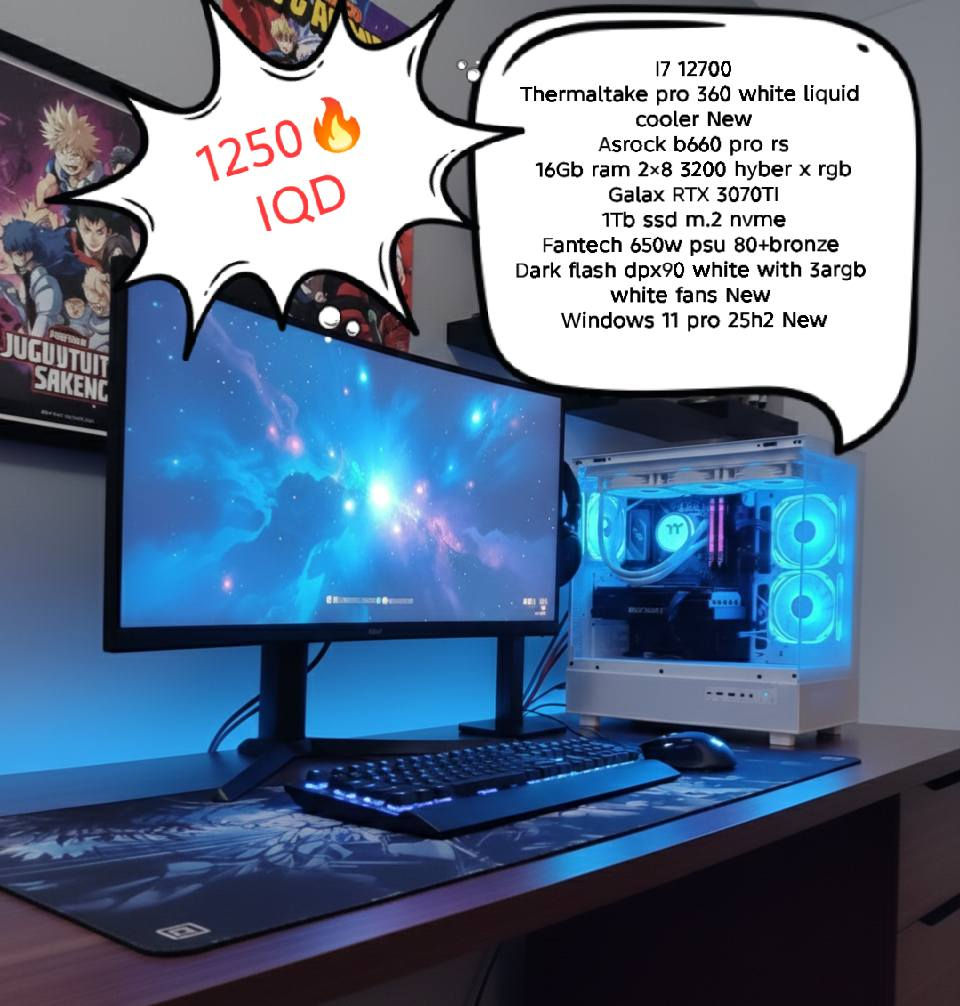 السلام عليكم 🌹 حاسبة للبيع الكيس+ المبرد +الهارد كلهن جدد باقي الغراض مستعمل اخو الجديد حاسبة كلش قويه تشغل كل الالعاب على 4k وفريمات عاليه وتخدمك بثوث برمجه تصميم منتاج كلشي حرفيا المواصفات : I7 12700 Thermaltake pro 360 white liquid cooler New Asrock b660 pro rs 16Gb ram 2×8 3200 hyber x rgb Galax RTX 3070TI 1Tb ssd m.2 nvme Fantech 650w psu 80+bronze Dark flash dpx90 white with 3argb white fans New Windows 11 pro 25h2 New السعر مليون وربع 1,250,000 دينار 🔥🔥🔥 السعر نهائي ما بيه مجال 🔒 ضمان شهر اي خلل ترجعلك فلوسك 💯 توصيل متوفر 🚚 وعندي شاشة msi 2k 180hz 27inch سعرهه 240 الف 🔥 وماوس وكيبورد ميكانيكي و ماوس باد وسماعات ويدة كلهن بسعر 125 الف اذا تاخذ الحاسبة والشاشة والاكسسوارات كلهن يصير مجموعهن اقل اسويلك خصم السعر كامل بدون الخصم: 1,615,000 السعر كامل: 1,575,000 مليون و 575 الف دينار 🔥🔥🔥 عنواني بغداد السريدات الجديدة وره صيطرة الشعب للحجز خاص او واتساب : ***********