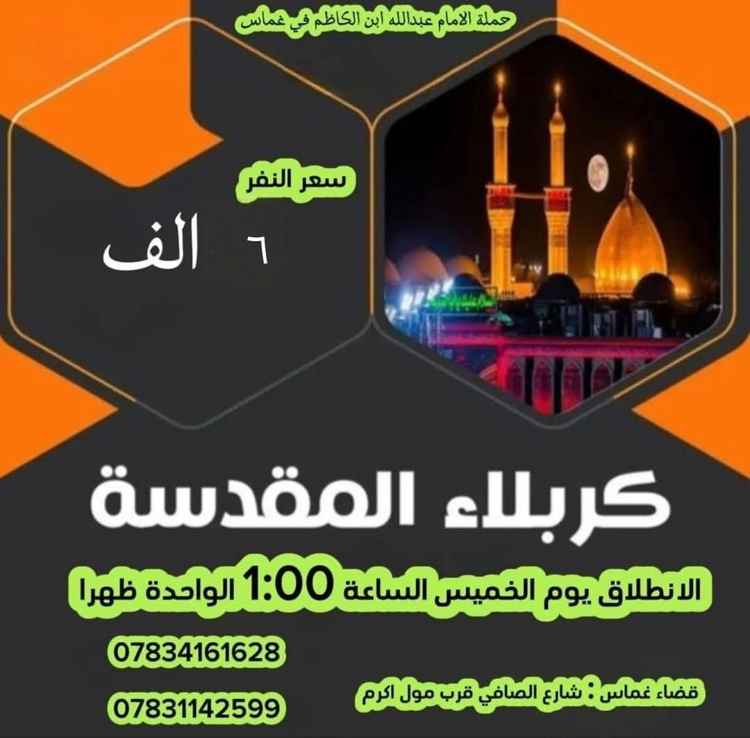 حملة الامام عبدالله ابن الكاظم ع في غماس سوف تنطلق يوم الخميس الئ كربلاء المقدسه النفر ٦ الالف دينار بأحدث الباصات المكيفه للحجز والاستفسار التواصل معنا عبر  هذا الرقم   ***********والحساب واهلا بكم جميعا💐.               ***********