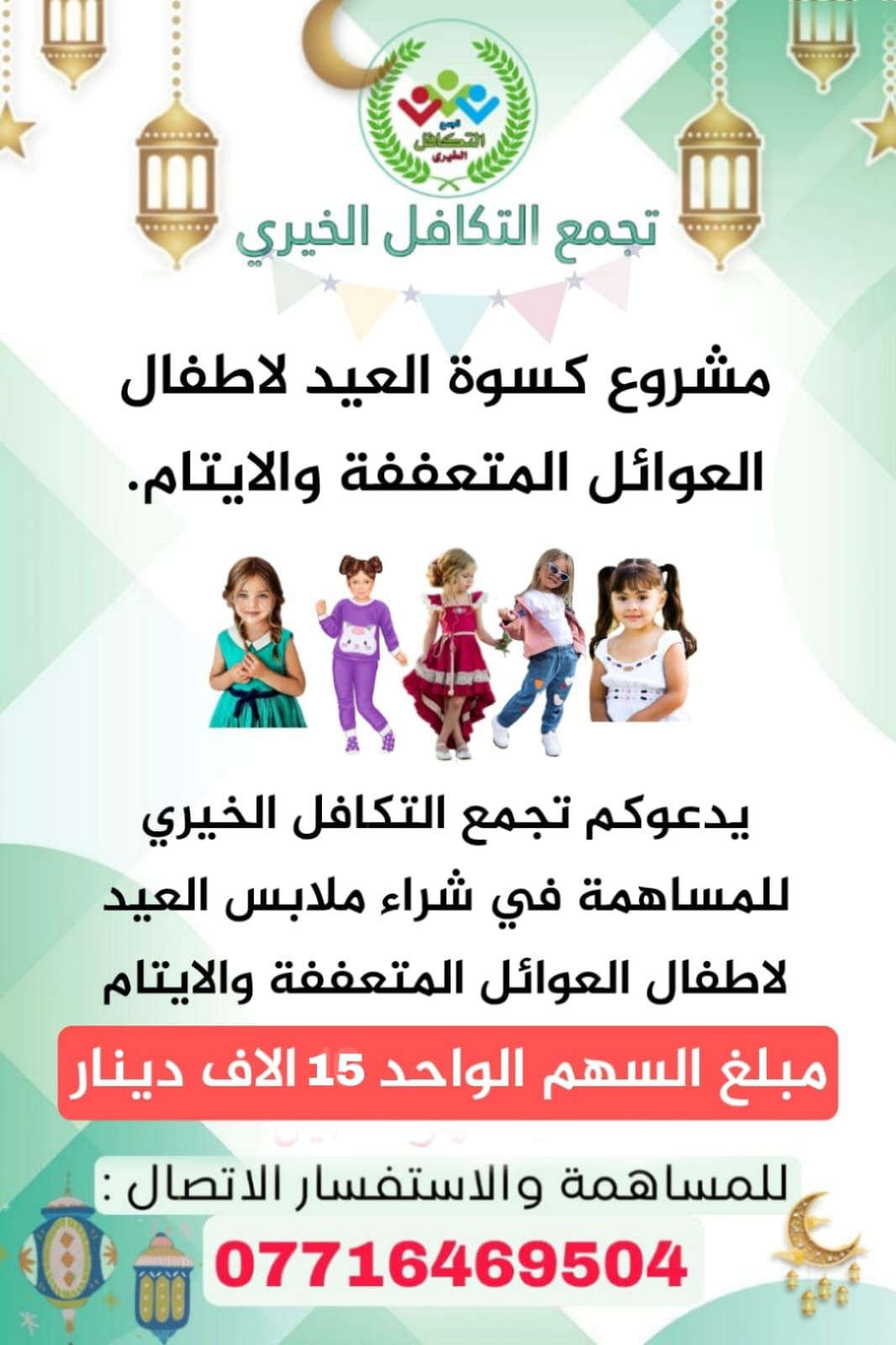 كسوة يتيم عطاء يدفئ القلوب قبل الاجساد بتبرعك تكتمل فرحتهم ويعظم أجرك ساهم معنا من اجل فرحة طفل يتيم ومتعفف في كسوه العيد هنيئا الفاعل الخير ونحن في العشره الأواخر من شهر رمضان شهر الخير والعطاء والزكاة فساهم وكن سبب بي فرحة طفل مبلغ السهم الواحد 15 الف دينار ولكم الأجر والثواب العظيم ان شاءالله للمعلومات الاتصال على الارقام التالية *********** *********** زين كاش 9860385088 ماستر كارد فرح علي شارك المنشور الدال على الخير كفاعله تجمــــــــــــــــــــع التكافل الخيـــــــري