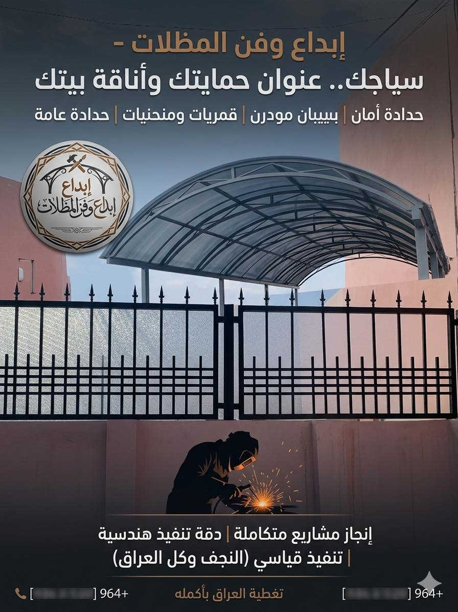 🏗️ إبداع وفن المظلات نجعل من واجهة منزلك ومساحاتك الخارجية لوحة فنية تجمع بين الأناقة الفائقة والحماية المطلقة. يسعدنا أن نقدم لكم أحدث أعمالنا في تنفيذ الأسيجة الفاخرة، حيث تجتمع دقة "إبداع وفن المظلات" مع المواصفات العالية التي تستحقها بيوتكم: • تغليف مزجج ضد الكسر: لمسة عصرية بتغليف خاص يتحمل الصدمات والظروف الجوية القاسية، لضمان الجمال والأمان معاً في آن واحد. • إتقان في التنفيذ: كل قطعة حديد مشغولة بعناية فائقة لضمان عمر مديد ومقاومة تامة، تماماً كما عودناكم في مظلاتنا. • أسعار تنافسية: الجودة العالية لا تعني بالضرورة السعر الخيالي؛ نقدم لكم أفضل العروض التي تناسبكم مع الحفاظ على مستوى الاحتراف والتميز. نحن في "إبداع وفن المظلات" لا نصنع مجرد سياج أو مظلة، بل نرسم بالحديد لوحة فنية تعكس خصوصية منزلك وتزيده جمالاً. للتواصل والاستفسار: 📞 الاتصال على الرقم: *********** 📩 أو مراسلة الصفحة مباشرة. إبداع وفن المظلات حيث تلتقي المهارة بالفن.