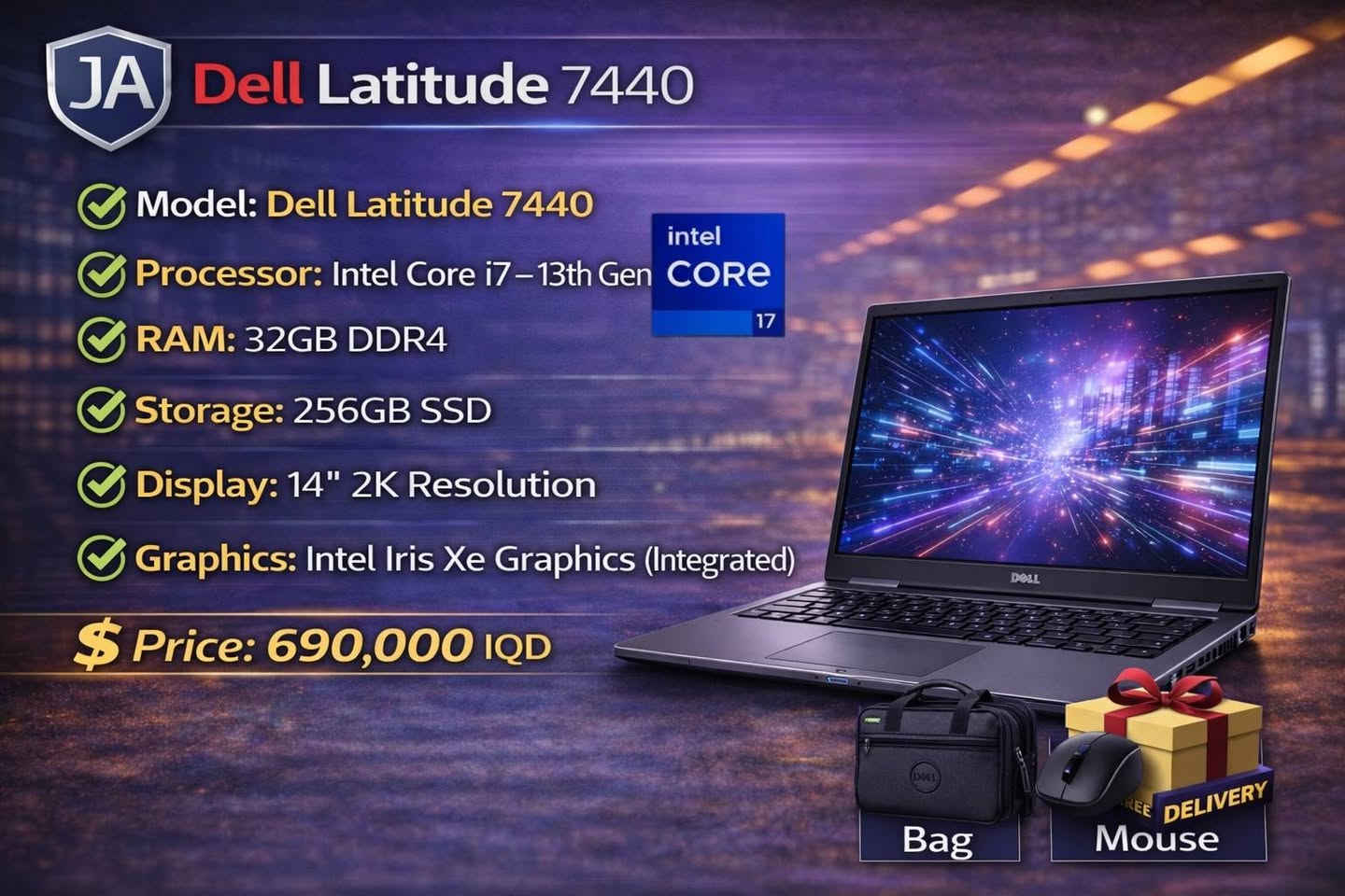 #عرض_العيد_يمنا_بفارق_قوي💪 #معالج_جيل_13_حديث_جدا نسولف عالعرض هذا الموديل كان برام 16 معروض ب725 الف هسه صار برام 32 وبسعر ارخص #فقط_690_الف🔥 💻 Dell Latitude 7440 – قمة الفخامة والأداء 🔥 جهاز أعمال فاخر يجمع بين القوة والتصميم الأنيق، مناسب للشغل الثقيل والاستخدام الاحترافي ✔️ Processor: Intel Core i7 – 13th Gen ✔️ RAM: 32GB DDR4 ✔️ Storage: 256GB SSD ✔️ Display: 14" 2K High Resolution دقة الشاشة 1920☆☆1200 قريبه جدا من 2k اعلى من FHD 💪 ✔️ Graphics: Intel Iris Xe Graphics (Integrated) ✔️ Build & Design: تصميم فاخر وخفيف مناسب لرجال الأعمال والتنقل ✔️ كيبورد عربي انكليزي مضاء بالخلف 🎁 مناسب للأعمال | الدراسة المتقدمة | البرمجة | التصميم الخفيف **إذا كنت صاحب هذا الإعلان وتريد حذفه لأي سبب، رجاءا أرسل رسالة إلى الدعم الفني**