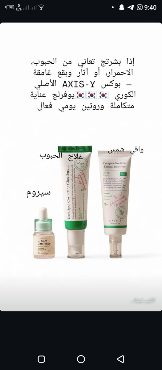 إذا بشرتج تعاني من الحبوب، الاحمرار، أو آثار وبقع غامقة — بوكس AXIS-Y الأصلي الكوري 🇰🇷🇰🇷🇰🇷يوفرلج عناية متكاملة وروتين يومي فعال ✨ يحتوي البكج على 3 منتجات أساسية يشتغلون مع بعض حتى يعالجون ويحمون البشرة: 💧 سيروم Dark Spot يساعد على تفتيح آثار الحبوب، يوحد لون البشرة ويمنح إشراقة صحية 🌿 علاج الحبوب Spot Treatment يهدئ الحبوب بسرعة، يقلل الاحمرار ويساعد على اختفائها ☀️ واقي شمس SPF50+ يحمي البشرة من التصبغات وأشعة الشمس، يرطب وما يترك طبقة بيضاء **إذا كنت صاحب هذا الإعلان وتريد حذفه لأي سبب، رجاءا أرسل رسالة إلى الدعم الفني**