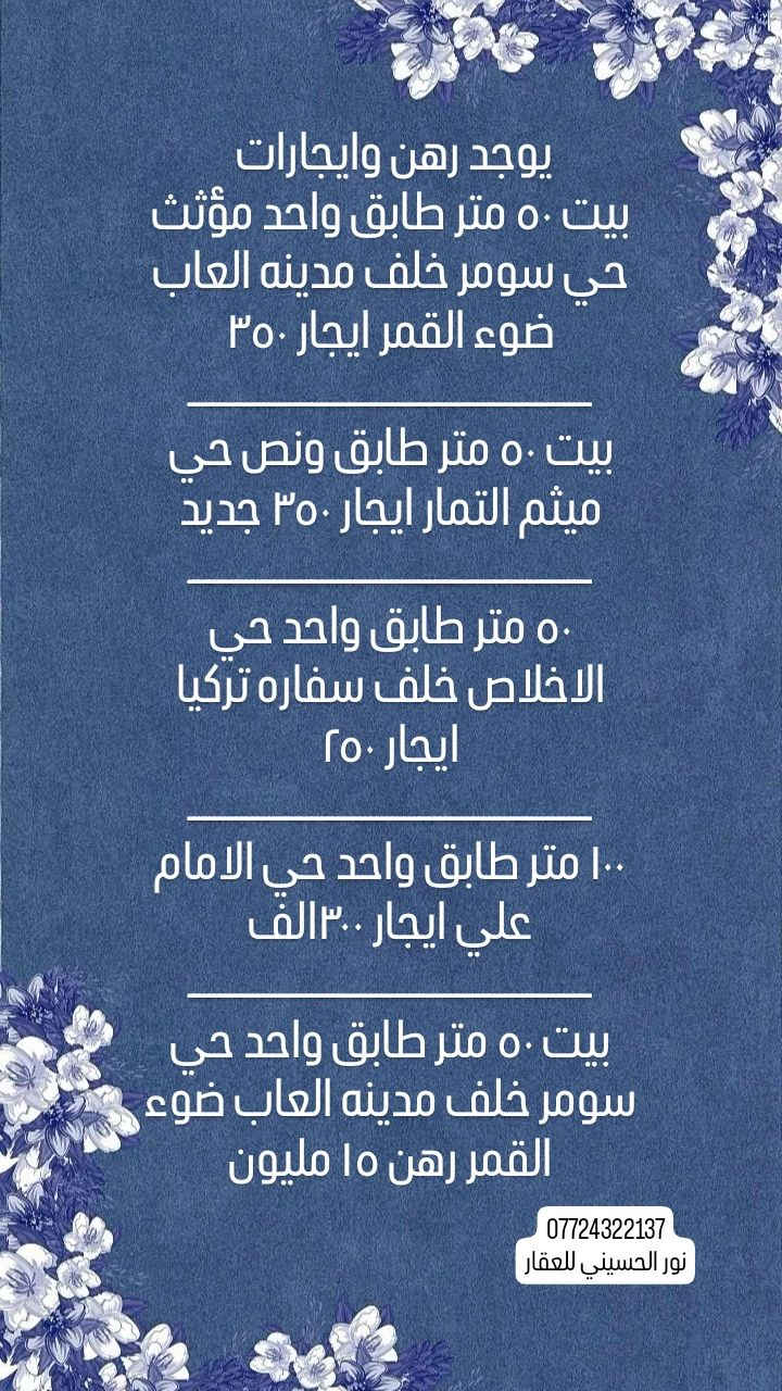 يوجد رهن وايجارات بيت ٥٠ متر طابق واحد مؤثث حي سومر خلف مدينه العاب ضوء القمر ايجار ٣٥٠ ـــــــــــــــــــــــــــــــــــــــــــــــــــــــــــــــــــــــــــ بيت ٥٠ متر طابق ونص حي ميثم التمار ايجار ٣٥٠ جديد ـــــــــــــــــــــــــــــــــــــــــــــــــــــــــــــــــــــــــــ ٥٠ متر طابق واحد حي الاخلاص خلف سفاره تركيا ايجار ٢٥٠ ـــــــــــــــــــــــــــــــــــــــــــــــــــــــــــــــــــــــــــ ١٠٠ متر طابق واحد حي الامام علي ايجار ٣٠٠الف ـــــــــــــــــــــــــــــــــــــــــــــــــــــــــــــــــــــــــــ بيت ٥٠ متر طابق واحد حي سومر خلف مدينه العاب ضوء القمر رهن ١٥ مليون ***********