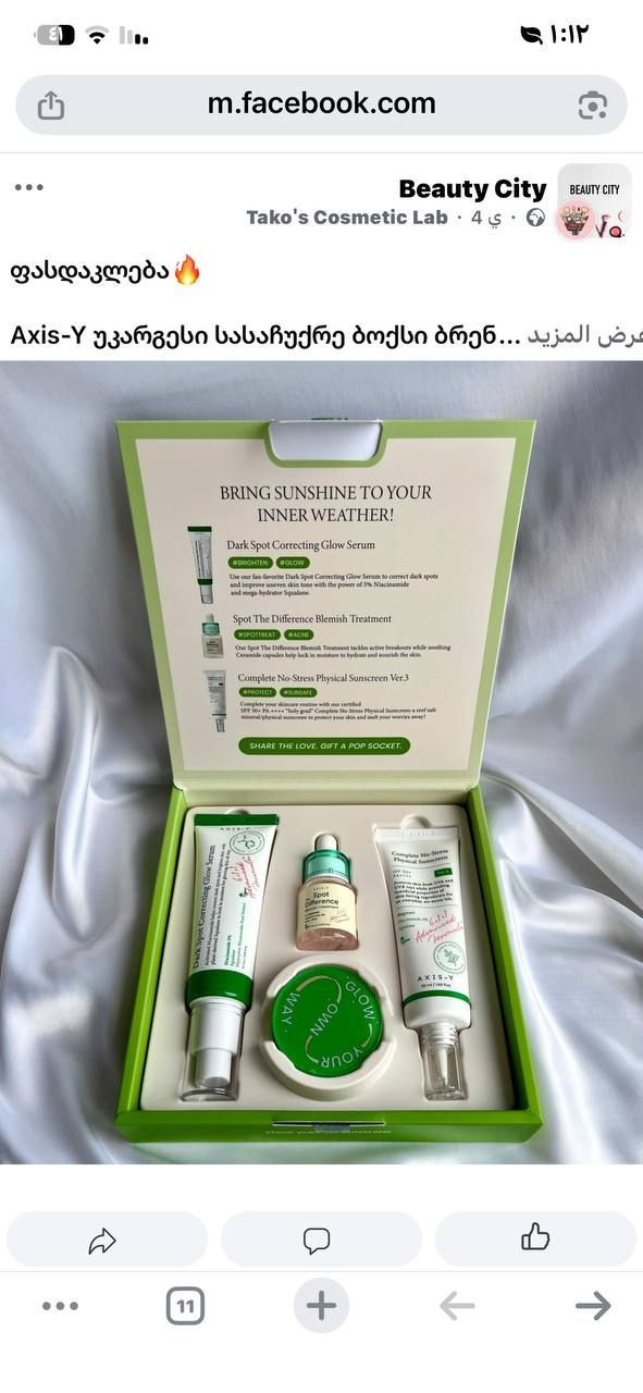 إذا بشرتج تعاني من الحبوب، الاحمرار، أو آثار وبقع غامقة — بوكس AXIS-Y الأصلي الكوري 🇰🇷🇰🇷🇰🇷يوفرلج عناية متكاملة وروتين يومي فعال ✨ يحتوي البكج على 3 منتجات أساسية يشتغلون مع بعض حتى يعالجون ويحمون البشرة: 💧 سيروم Dark Spot يساعد على تفتيح آثار الحبوب، يوحد لون البشرة ويمنح إشراقة صحية 🌿 علاج الحبوب Spot Treatment يهدئ الحبوب بسرعة، يقلل الاحمرار ويساعد على اختفائها ☀️ واقي شمس SPF50+ يحمي البشرة من التصبغات وأشعة الشمس، يرطب وما يترك طبقة بيضاء المنشأ كوريا الأصلي 🇰🇷 **إذا كنت صاحب هذا الإعلان وتريد حذفه لأي سبب، رجاءا أرسل رسالة إلى الدعم الفني**