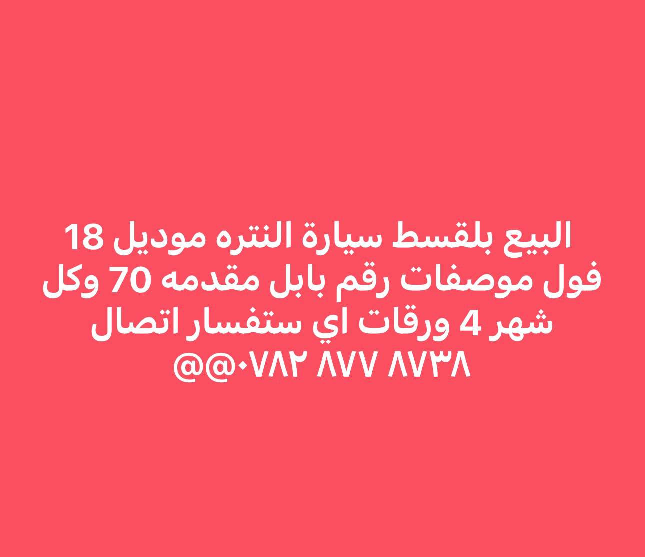 النتره موديل2018فول موصفات بيع قسط مقدمه 70 وكل شهر 4 ورقات تفضل خاص بغداد, العراق **إذا كنت صاحب هذا الإعلان وتريد حذفه لأي سبب، رجاءا أرسل رسالة إلى الدعم الفني**