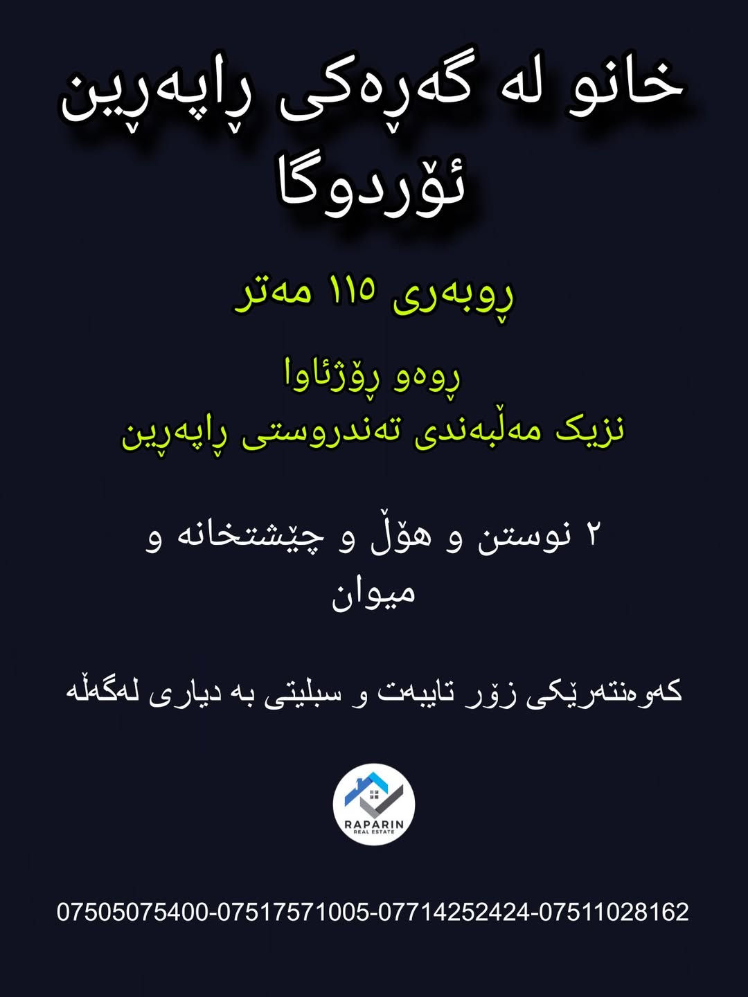 وەرە ئەو خانوەت بۆ بکڕم بە نرخی گونجاو خانویەکی زۆر هەرزان و پوختمان بۆ هێناون لەگەڕەکی ڕاپەڕین نزیک مەڵبەندی تەندروستی ڕاپەڕین نزیک کتێبخانەی گشتی ڕاپەڕین خانوەکەمان پوختەو کامل کۆڵانی قیرو و خەدەماتە تایبەتمەندیەکانی 🔴 دوو نوستن 🔴هۆڵ 🔴میوان 🔴چێشتخانە 🔴کراوە 🔴تەوالێت و حەمام 🔴ڕوەو ڕۆژئاوا 🔴نزیک باخچەی منداڵان و مەڵبەندی تەندروستی ڕاپەڕین و قوتابخانە 🔴نزیک شەقامی گشتی ڕانیە چوارقوڕنە 🔴پوخت و خاوێن و هەرزان 🔴نزیک کتێبخانەی ڕاپەڕین کۆمێنتێک بنوسە و نرخت پێدەگات ئێمە نێوەندگیری ڕاستەقینەین لە ئێستادا نوسینگەی خانوبەرەی ڕاپەڕین سەرپەرشتی فرۆشتنی ئەو موڵکە دەکات، بۆ زانیاری زیاتر پەیوەندی بکەن یاخود سەردانی نوسینگە بکەن ***********-***********-***********-***********
