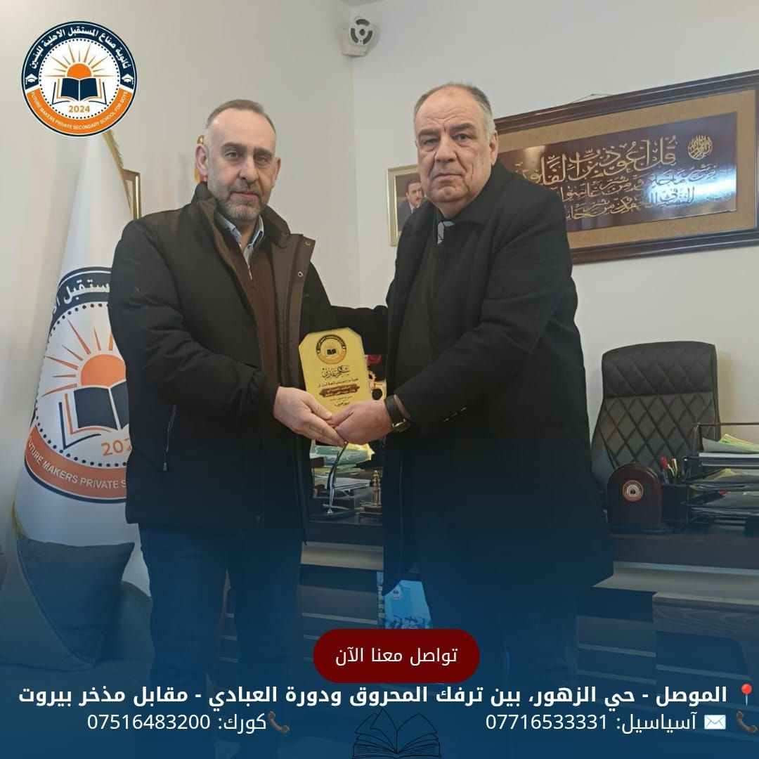 تتقدم إدارة ثانوية صناع المستقبل الأهلية للبنين بالشكر والتقدير إلى الدكتور الصيدلاني بلال عبد الغني توفيق صاحب صيدلية ارواد ولي أمر الطالب علي في الصف الثاني المتوسط شعبه A وذلك لدعمه المستمر لثانويتنا وتقديرا وعرفاناً لدوره تم تقديم درع شكر وتقدير مقدم من إدارة المدرسة المتمثلة بمدير المدرسة الأستاذ مقدام السيد جاسم محمد للحجز والأستفسار الأتصال على الأرقام الموضحة أدناه 📍 الموصل - حي الزهور، بين ترفك المحروق ودورة العبادي - مقابل مذخر بيروت 📞 ✉️ آسياسيل: *********** (متاح على واتساب وتليجرام) 📞كورك: *********** #ثانوية_صناع_المستقبل_الاهلية