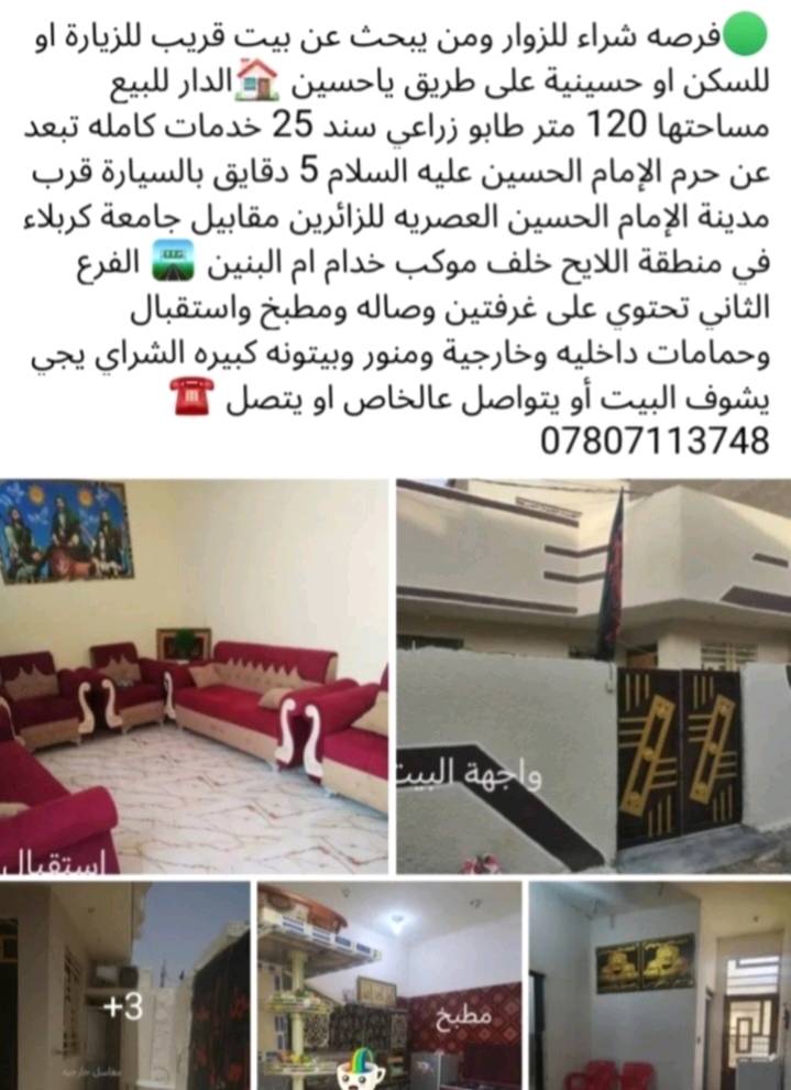 🟢فرصه شراء للزوار ومن يبحث عن بيت قريب للزيارة او للسكن او حسينية على طريق ياحسين 🏠الدار للبيع مساحتها 120 متر طابو زراعي سند 25 خدمات كامله تبعد عن حرم الإمام الحسين عليه السلام 5 دقايق بالسيارة قرب مدينة الإمام الحسين العصريه للزائرين مقابيل جامعة كربلاء في منطقة اللايح خلف موكب خدام ام البنين 🛣️ الفرع الثاني تحتوي على غرفتين وصاله ومطبخ واستقبال وحمامات داخليه وخارجية ومنور وبيتونه كبيره الشراي يجي يشوف البيت أو يتواصل عالخاص او يتصل ☎️ ***********