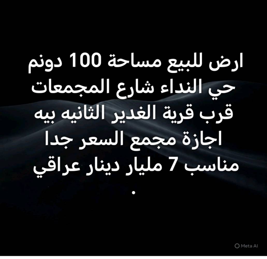 ارض للبيع مساحة 100 دونم حي النداء شارع المجمعات قرب قرية الغدير الثانيه بيه اجازة مجمع السعر جدا مناسب 7 مليار دينار عراقي .