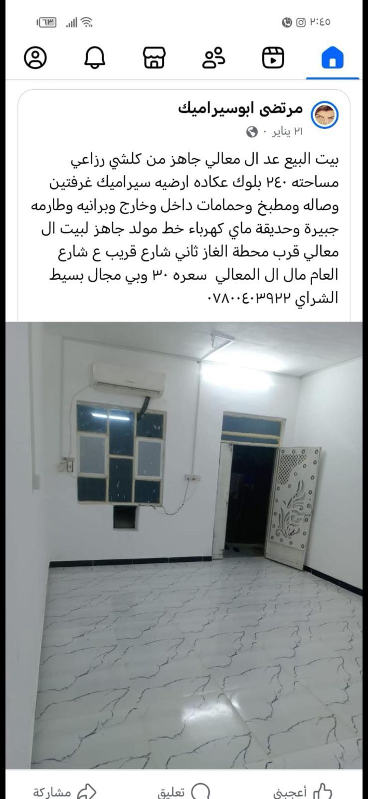 بيت البيع عد ال معالي زراعي ٢٣٠متر مساحته بلوك عكاده ارضيه سيراميك غرفتين وصاله ومطبخ وحمامات داخل وخارج وبرانيه وطارمه جبيرة وحديقة ماي كهرباء خط مولد جاهز من كلشي ال معالي تقاطع الغاز سعر ب٣٠ ***********رقم صاحب البيت