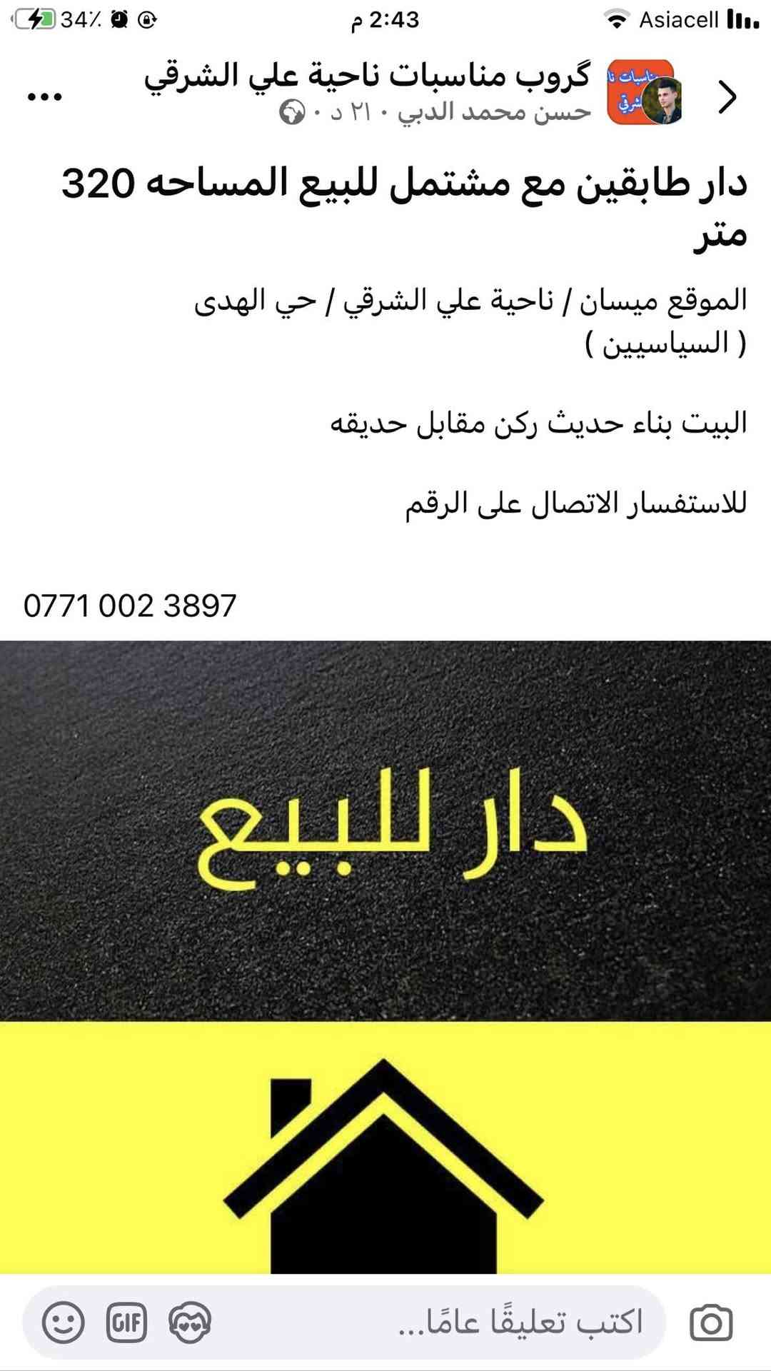 دار طابقين مع مشتمل للبيع المساحه 320 متر ميسان ناحية علي الشرقي حي الهدى البيت بناء حديث ركن مقابل حديقه للاستفسار الاتصال على الرقم 0771 002 3897
