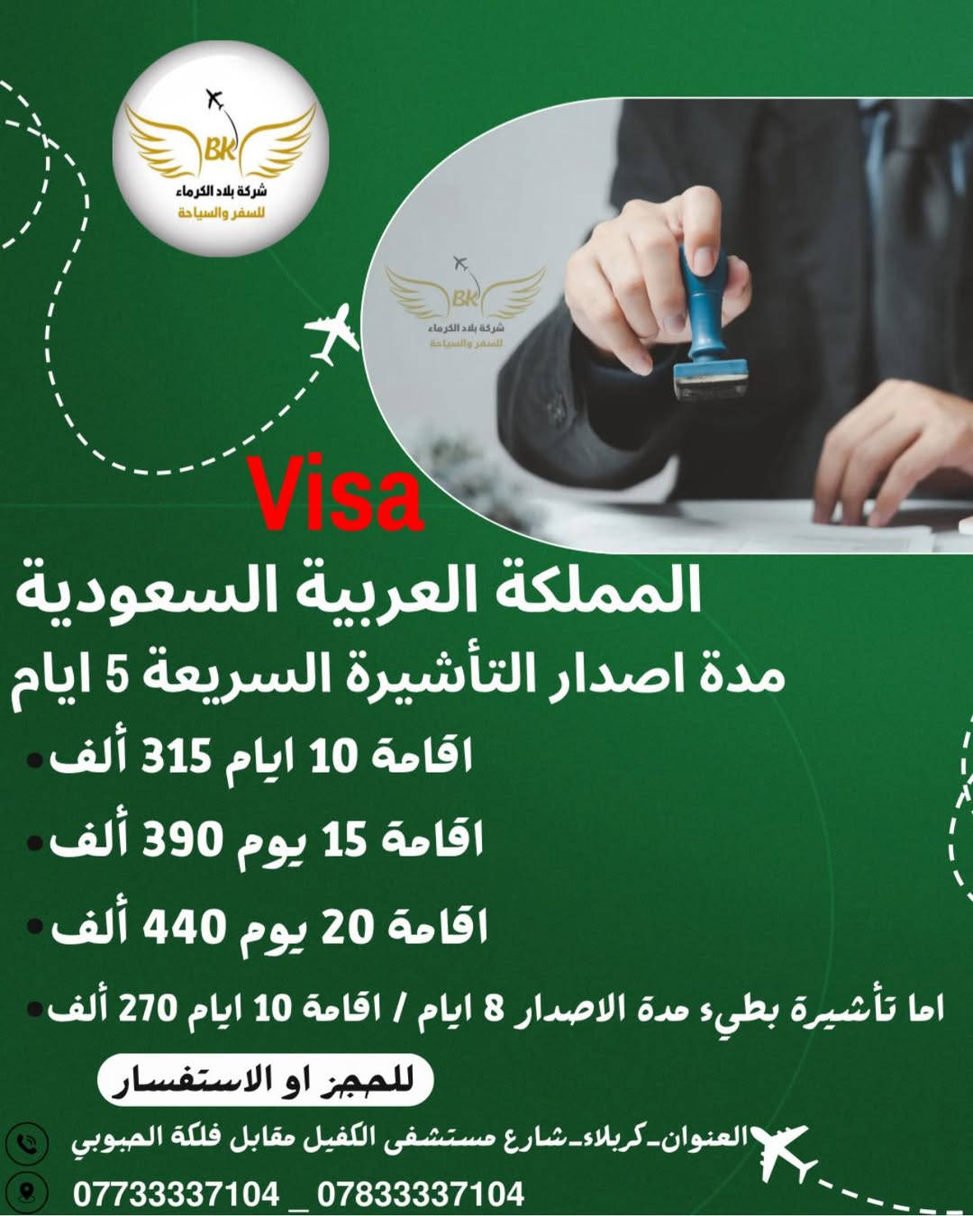 تأشيرة الدخول إلى المملكة العربية السعودية 🔵تتوفر فيزا بطيء مدة الاصدار _ 8 أيام ♦️مدة الإقامة 10 أيام بـ270 ألف 🔵تتوفر فيزا سريعة مدة الاصدار _ 5 أيام ♦️مدة الإقامة 10 أيام بـ315 ألف ♦️مدة الإقامة 15 يوم بـ390 ألف ♦️مدة الإقامة 20 يوم بـ440 ألف للحجز والاستفسار 💁‍♂️👨‍💻 كربلاء المقدسة : قرب مستشفى الكفيل ـ مقابل فلكة الحبوبي *********** *********** *********** ***********