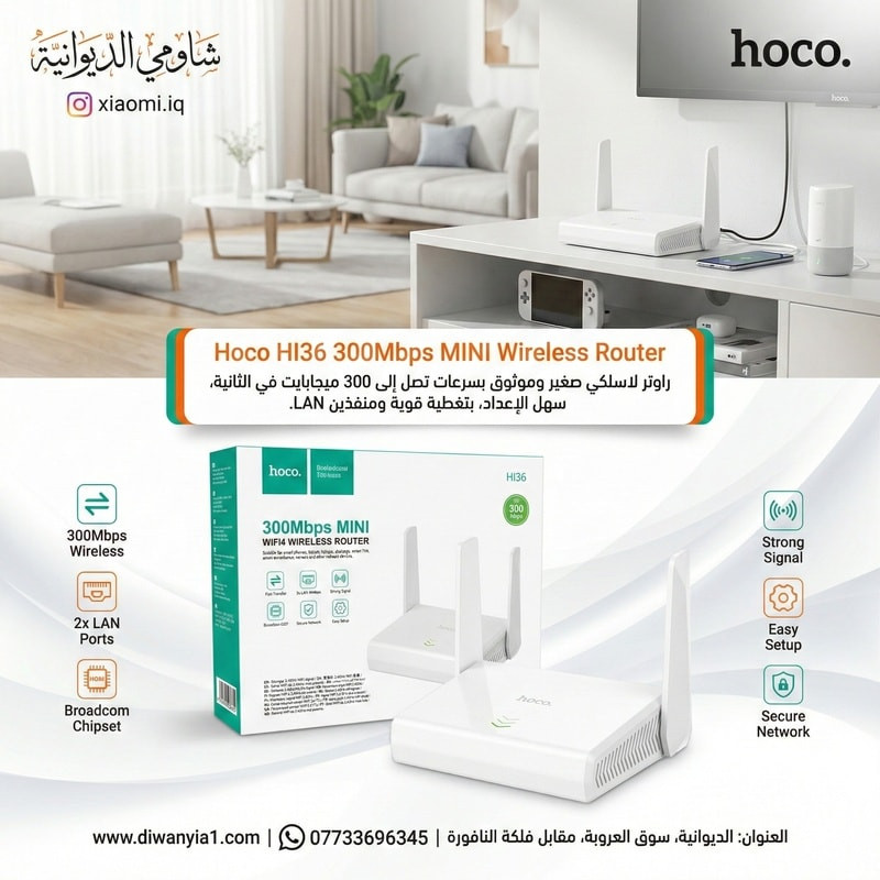 Hoco HI36 300Mbps MINI Wireless Router 15,000 د.ع فقط 15 الف 🔥💣 Hoco HI36 300Mbps MINI Wireless Router راوتر "هوكو" الصغير.. الأداء القوي بحجم مثالي لتوزيع الإنترنت بالبيت أو المكتب واستقرارية عالية بالإشارة. (ضمان استبدال للمنتج مباشر خلال 6 اشهر) 🛡️ المواصفات التقنية الفول: 🌐 السرعة: يصل لسرعة 300Mbps، يعني تصفح سريع ومشاهدة فيديوهات بدون تقطيع. 🧠 المعالج: مزود بشريحة Broadcom 5357 العالمية اللي تضمن استقرارية الإشارة حتى مع الحمل العالي. 📡 التغطية: يحتوي على 2 هوائيات (Antennas) خارجية لضمان وصول الإشارة لمسافات أبعد واختراق الجدران. 🔌 المنافذ: يحتوي على 2 منافذ LAN بسرعة 100Mbps لربط الأجهزة مباشرة بالكيبل (مثل الشاشات أو الكمبيوتر). 📶 التردد: يعمل بتردد 2.4GHz المتوافق مع كل أنواع الموبايلات والأجهزة الذكية. ⚙️ سهولة الإعداد: ميزة Easy Setup تخليك تضبط إعدادات الراوتر بدقائق بدون تعقيد. 🛡️ الأمان: يدعم بروتوكولات حماية متطورة لضمان أمان شبكتك من الاختراق. 📏 التصميم: حجم "ميني" عصري ومناسب لأي مكان وما ياخذ مساحة. العنوان: الديوانية، سوق العروبة، مقابل فلكة النافورة. رقم التواصل: *********** (توصيل لباب بيتك باي مكان بالعراق 🚙 👌) (لمزيد من المنتجات والتخفيضات فقط ابحث على المتصفح عن شاومي الديوانية 👌)